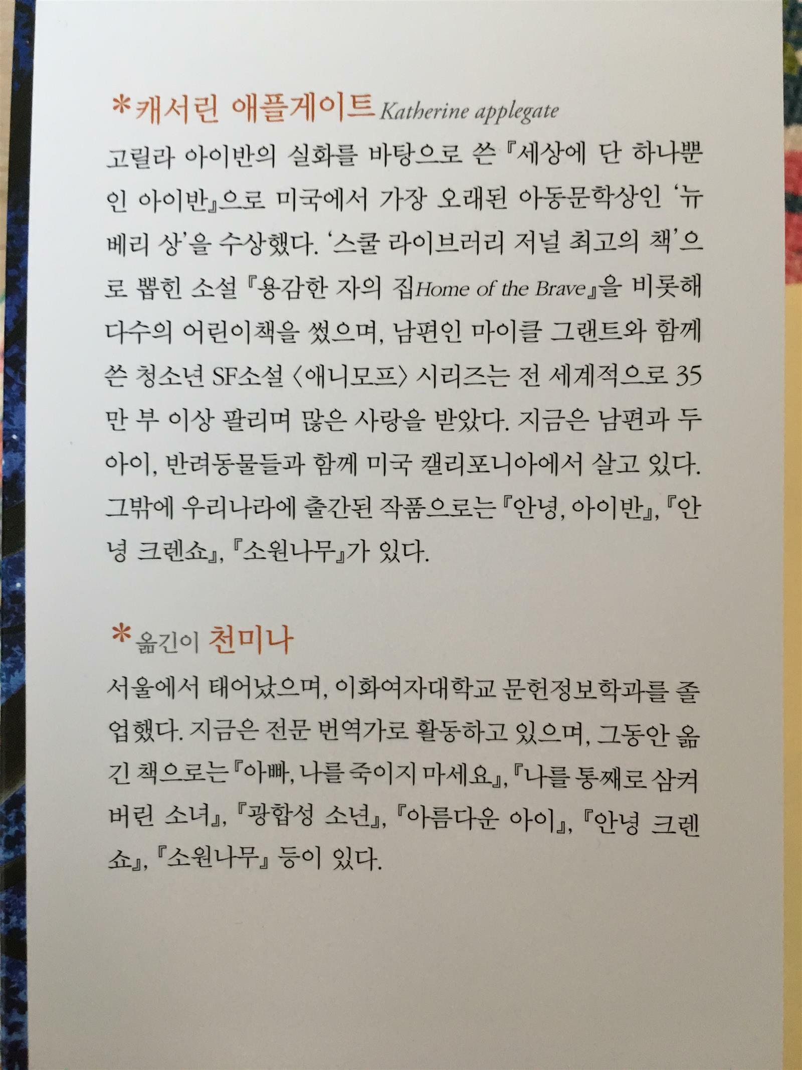 고릴라를 주인공을 한 작품으로 뉴베리 상을 받았다고 해요.