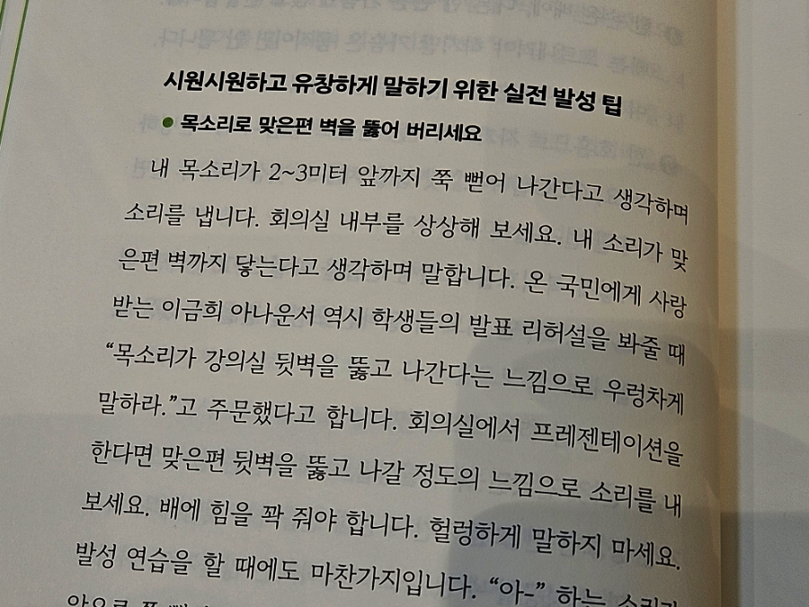 사담을 할 때와는 다른 이로가 관련된 말하기가 시작되면 김 대리는 잔쯕 얼어붙어 목소리가 잘 나오지 않고 모두에게 들리도록 크게 말해야 하는데 목소리는 기어들어가고 여소처럼 떨리기까지 하다. 이런 상황을 모두 선배에세 설명하자 선배는 먼저 '말하는 방법'부터 익혀야겠다고 정확한 진단을 내렸다.