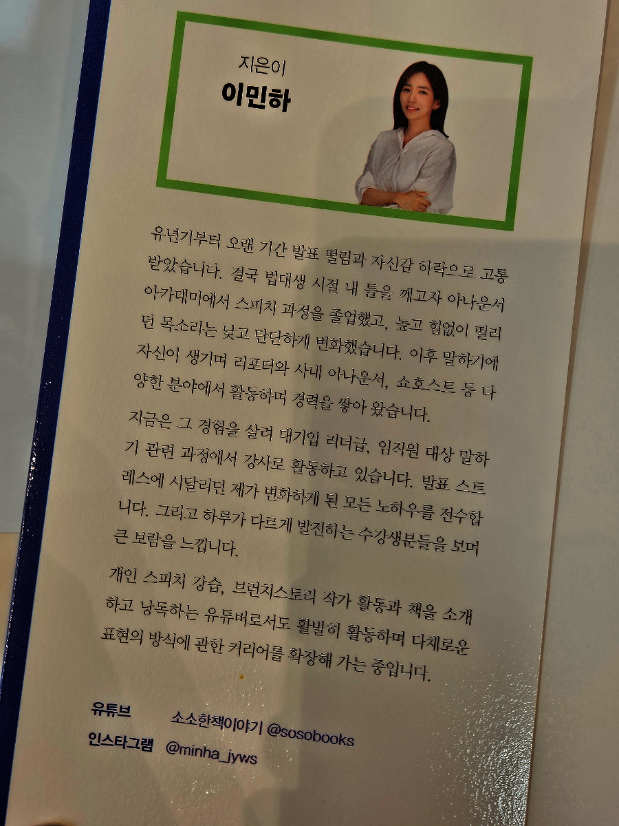 유년기부터 오랜 기간 발표 떨림과 자신감 하락으로 고통을 받아온 작가, 결국 법대생 시절 내 틀을 깨고자 아나운서 아카데미에서 스피치 과정을 졸업하고 높고 힘이 떨리던 목소리는 낮고 단단하게 변화했다. 이후 말하기에 자신이 생기며 리포터와 사내 아나운서, 쇼호스트 등 다양한 분야에서 활동하며 경력을 쌓아왔다.
