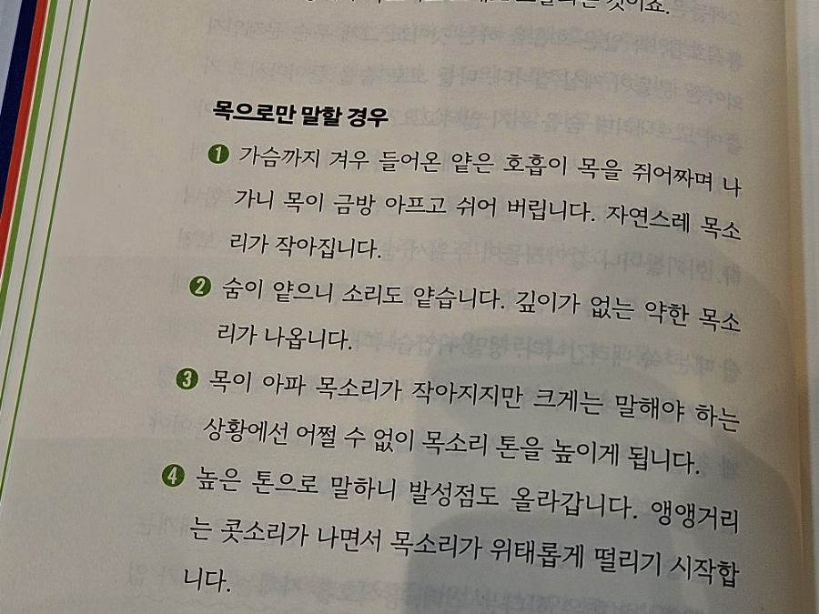 1. 가슴까지 겨우 들어온 얕은 호흡이 목을 쥐어짜며 나가니 목이 금방 아프고 쉬어버린다. 자연스레 목소리가 작아진다.