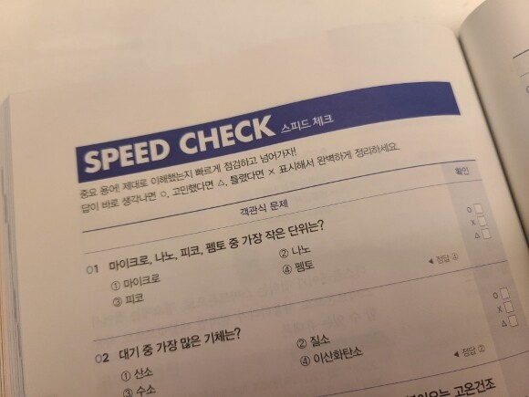 SPEED CHECK(스피드 체크)는 중요 용어를 제대로 이해했는지 빠르게 점검하고 넘어갈 수 있도록 구성되어있고, 최종 점검용으로 풀어보고 반복 학습하시면됩니다.