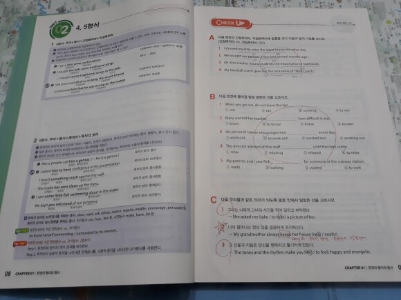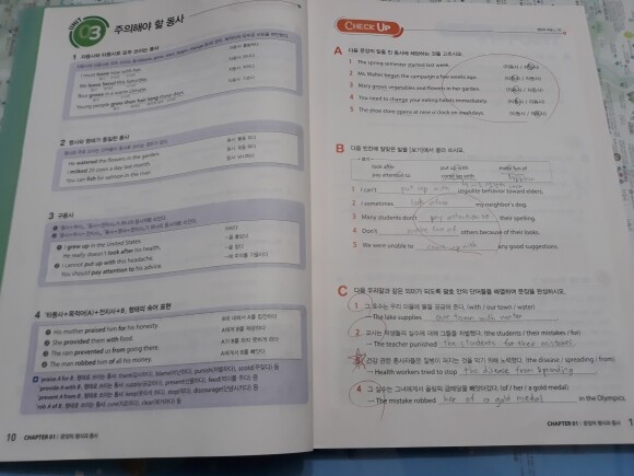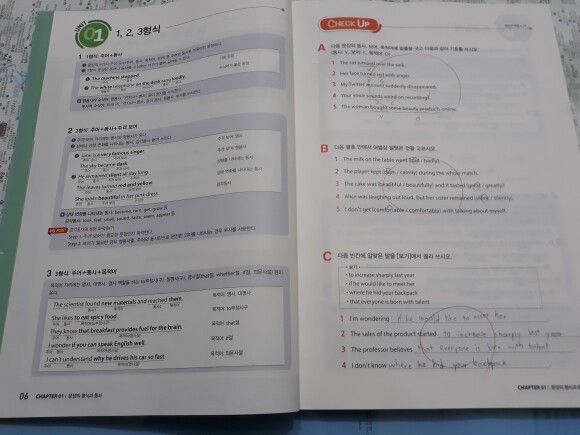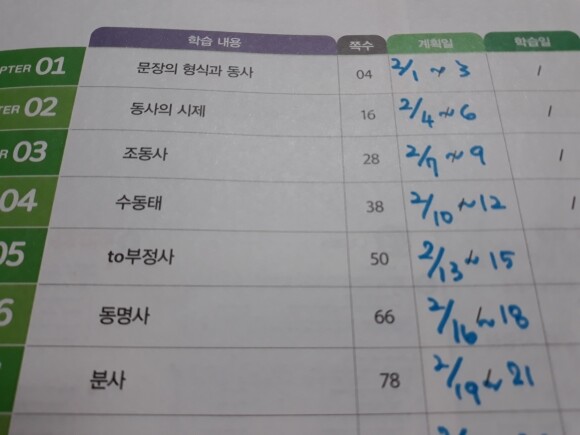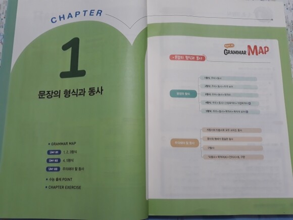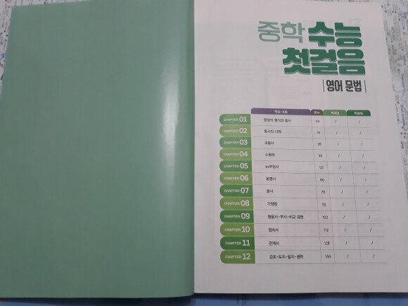 산뜻하고 깔끔한 민트색에귀여운 캐릭터가 눈에 띄는 표지를 펼쳐보니CHAPTE 1~ 12까지 총 12개의 영어 문법학습 내용 목차 겸 학습 계획표가있네요^^아이가 직접 계획을 세우고계획에 맞게 스스로 학습하면서소복소복 영문법 실력을 쌓을 수 있겠어요~형아 오리는 영어 문법에 자신이 없다고1 CHAPTER를 3일씩 학습하기로 했어요.드디어 학습을 시작한 형아 오리입니다^^단원 첫 장, 한눈에 보는 GRAMMAR MAP으로각 단원에서 배울 핵심 문법을 미리 엿볼 수 있어요.CHAPTER 1 문장의 형식과 동사문법 개념 설명을 꼼꼼하게 읽고CHECK UP 문제를 풀어보았어요.친절하고 자세한 문법 설명에대부분의 문제들은 잘 풀어주었는데요,오답이 두 문제 나왔네요.정답과 해설을 잘 읽어보고문법 개념 설명을 다시한번 확인해 보았답니다.첫 단추는 이렇게 기분좋게 채워졌네요^^지학사 <중학 수능 첫걸음 영어 문법>교재로중학 영어 문법의 완성와수능 영어로의 첫걸음을 잘 뗄 수 있도록이번 겨울방학 내내 열심히 공부해보겠습니다♡