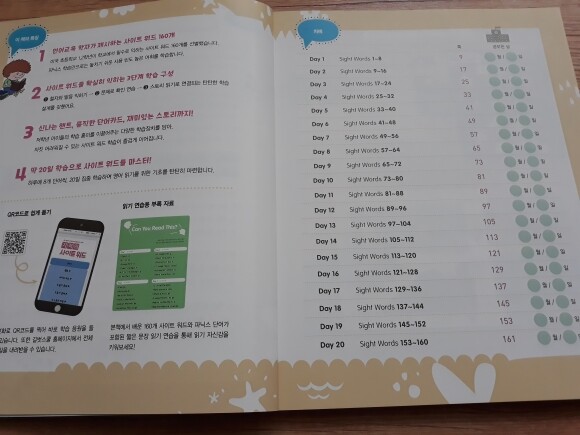 파닉스 규칙을 따르지 않는, 외울 수 밖에 없는,이러한 사이트 워드를 신나는 첸트와 흥미로운 스토리를 통해서 쉽고 재미있게 익혀 보아요~^^QR코드를 찍으면 바로 음원을 들을 수 있어서 발음을 정확하게 듣고 익힐 수 있답니다.이렇게 교재의 구성을 따라가며 20일 동안 꾸준히 학습하면 초등사이트워드 160개를 완벽하게 익힐 수 있겠어요.음원을 듣고 단어 따라 읽고, 쓰기, 문장을 통한 활용까지 학습할 수 있어서 엄마표 영어를 위한 초등 영어 교재로 만족 대 만족입니다^^http://gilbut.co/c/21118089nt #기적의사이트워드#초등영어단어#초등영단어#초등영어교재#엄마표영어#영어홈스쿨#사이트워드#초등사이트워드
