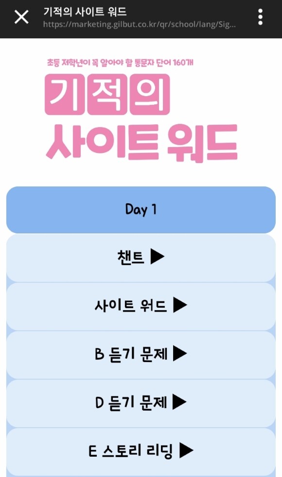 초등 4학년인 저희 아이는 사교육없이 오로지 엄마표로 영어 공부를 하고 있습니다.그래서 아이의 영어 학습을 위한 교재를 고르는 데에 꼼꼼하고 신중하게 고르는 편인데요,이번에 제 눈에 띈 교재는 바로 길벗스쿨의<기적의 사이트 워드>입니다.길벗스쿨은 영어 교재 뿐만아니라 국어, 수학, 외국어, 유아 학습서의 '기적' 시리즈를 출간하여 우리 아이들이 스스로 꾸준히 공부할 수 있도록 도와주는 출판사예요.이미 파닉스를 학습했지만, 파닉스 규칙을 따르지 않는 사이트 워드의 학습은 어떻게 해야할까요?바로바로 <기적의 사이트 워드> 교재가 있지요.< 기적의 사이트 워드>는 초등 저학년이 꼭 알아야 할 통문자 단어 160개를 20일동안 학습하도록 구성되어 있어요.각 단어마다 읽기와 뜻을 확인하고 체크할 수 있도록 체크표가 있어서 본문에서 배우고 익힌 철자와 발음을 잊지않고 오래도록 기억할 수 있습니다.
