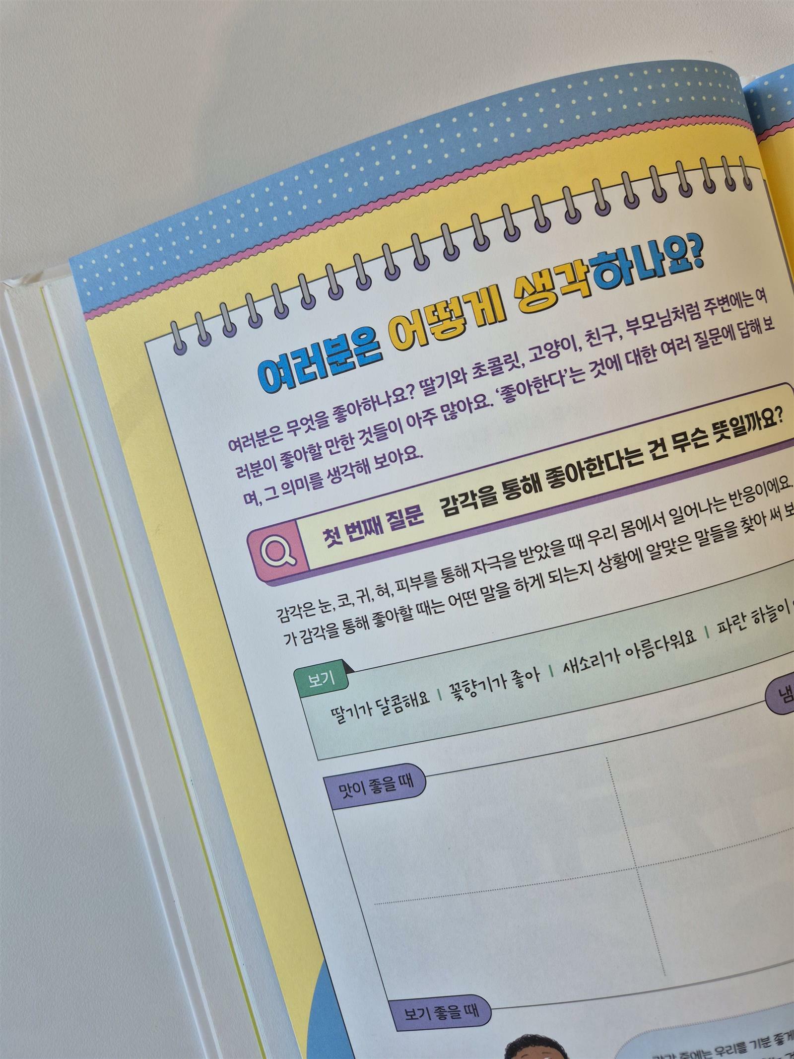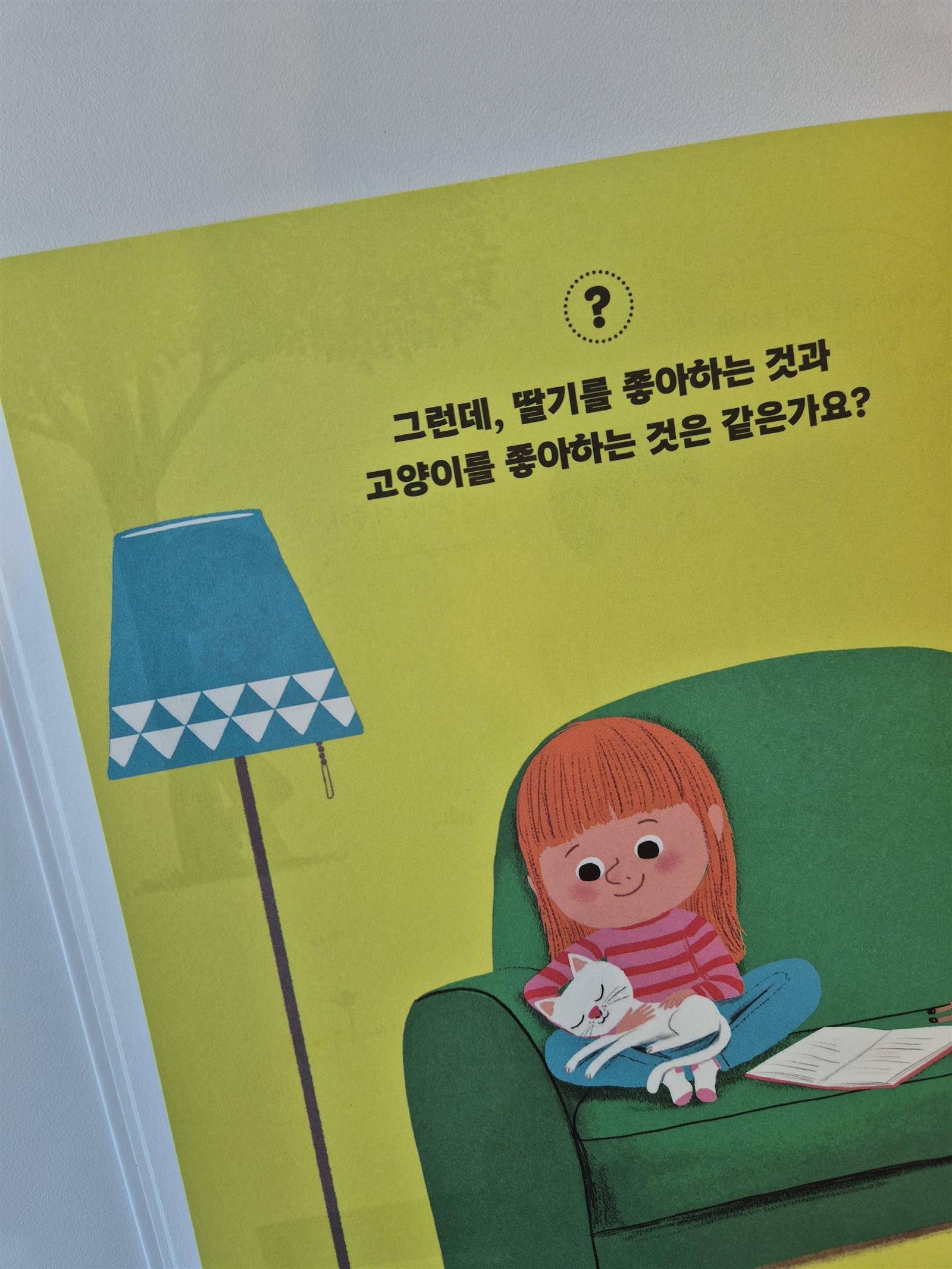 "좋아한다는 건 뭘까요?" 우리 삶에는 생각해 봐야 할 중요한 질문들이 있어요. 이 책은 철학을 처음 접하는 어린이도 스스로 질문을 던지고 자기만의 답을 찾을 수 있도록 도와줄 거예요. 제가 좋아하는 건요.. 아이들의 좋아하는 이야기로 동화를 시작해요. 어떤 게 좋은지 왜 좋은지 이유도 설명해 줘요. 책 속에 아이들이 좋아하는 게 뭔지 읽어주고 나서 "00이가 좋아하는 건 뭘까?" 질문해 보았어요. 그리고 이 책을 읽어주고 있는 엄마인 저에게도 질문해 보았답니다. 단순히 좋아하는 게 뭔지 묻는 게 아니라 책 속에 질문은 생각하는 힘을 기르는 "질문"이 담겨있어요. "그런데, 딸기를 좋아하는 것과 고양이를 좋아하는 것은 같은가요?" 책을 읽으면서 아이에게 계속 질문을 하니 "잘 모르겠어요. 그냥 좋아요. " 단답형 대단만 하더라고요. 이제 질문을 더 자주 해줘야겠어요. 우리 아이들이 이 책을 읽으면서 기대하는 것은 '질문할 줄 아는 능력'이에요. 질문이 좋아야 멋진 답도 생기는 법이니까요. 급변하는 사회 속에 많은 정보들을 접하고 있는데요. 우리가 놓치지 말아야 할 것은 '생각의 힘' 이랍니다. 책 속의 여러 주인공들이 던지는 질문을 답하다 보면 생각하는 힘은 저절로 길러지게 될 거예요. 좋아한다는 것에 대해 다양하게 이야기해보는 시간을 가져보세요. 그리고 질문의 답을 아이만 하는 게 아니라 엄마나 아빠가 먼저 질문의 답을 해봐도 좋겠어요. 의견을 주고받고 함께 생각한다면 답은 다양해지고 사유의 폭은 넓어질 거예요. 책 뒷부분에는 <독후 활동>으로 4가지 질문과 내 생각을 적어볼 수 있는 활동이 있어요. 프랑스에서 철학을 전공한 장석훈 작가의 정성이 담긴 코너랍니다. 내 생각을 적어봄으로써 생각이 정리되고, 더 많은 질문을 스스로 할 수 있는 힘을 기르는 의미도 담겨 있다고 합니다. [출판사로부터 도서 제공] .
