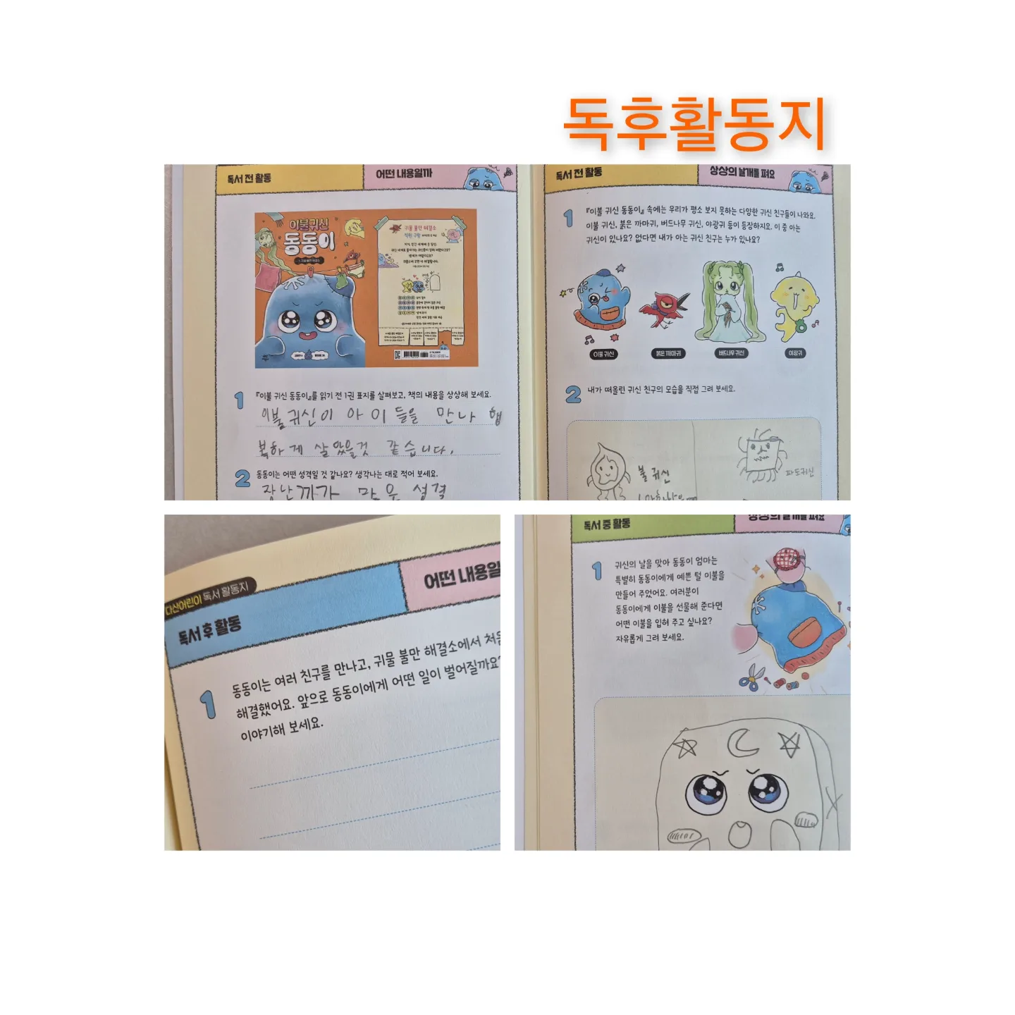 《 이불귀신 동동이 : 1.귀물 불만 해결소 》 ■이불귀신 동동이 책 포인트! - 귀여운 캐릭터와 재미있는 줄거리 - 독서 전 활동 / 독서 중 활동 / 독서 후 활동 - 책 속의 속담이 있고, 의미를 알 수 있어요. ■독후활동지 독서 후 활동지는 많이 해봤어요. 독서 전, 독서 중 활동지는 처음 해보았는데요. 아이들의 상상력이 정말 재밌었어요. 글씨를 못쓰더라도 그림으로 나의 생각을 표현할 수 있어서 좋았어요. 어휘력, 문해력에도 도움이 되니 독후활동지 너무 괜찮네요. ■ 귀신이 나오는 동화책에 거부감이 있었어요. 하지만 아이들은 귀신 나온다고 하면 너무 좋아하죠! 이불귀신 동동이에 나오는 귀신들은 너무 사랑스러워요! "인간 세계는 처음이라..." 천방지축 초보 귀신 동동이의 인간 세계 생존기 이불귀신 동동이는 소중한 친구를 잃기도 하고, 새로운 친구를 얻기도 하는데요...귀물 불만 해결소에서 일하게 된 동동이는 인간 세계에서 살아남을 수 있을까요? ■ 추천합니다. 교과 연계 되는 1,2,3학년이 보면 좋겠습니다. 귀여운 캐릭터를 좋아하는 초등학생 귀신이야기에 관심있는 유아들에게도 추천합니다. * 시리즈 책 답게 2권 예고편도 수록되어 있어서 기대하게 되네요! 2권 나오기 전에 1권 꼭 읽어두세요. [출판사로부터 도서 제공]