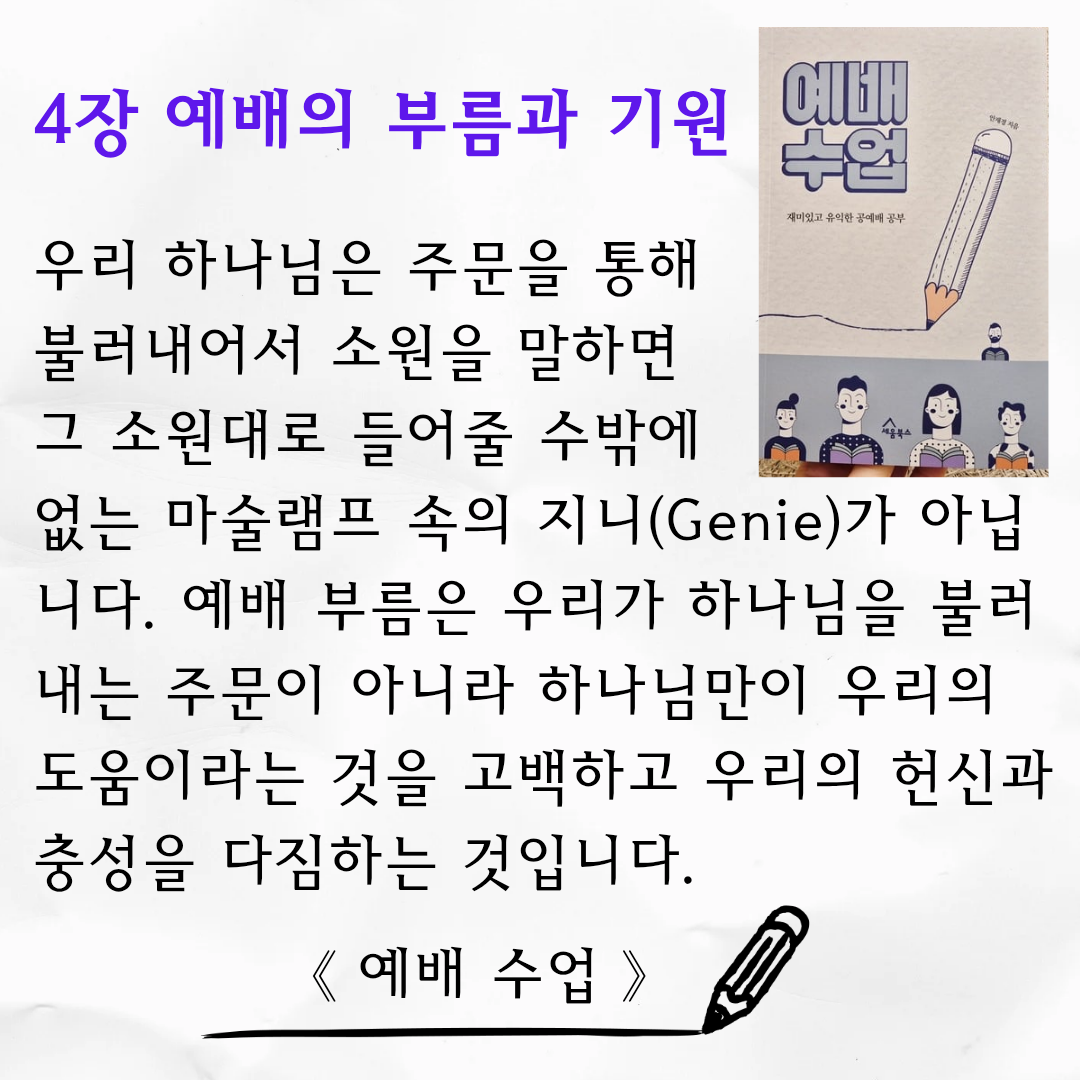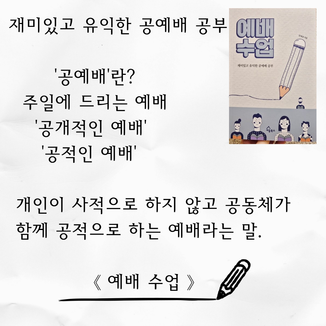 #도서협찬 ◽️ 예배 수업 ◽️ 안재경 지음 ◽️ 세움북스 ⠀ ✝️ 공예배 주일에 드리는 예배를 우리는 '공예배'라고 부릅니다. 공개적인 예배, 공적인 예배라는 뜻을 지니고 있지요. 개인이 사적으로 하지 않고 공동체가 함께 공적으로 하는 예배라는 말입니다. 저는 어려서부터 교회를 다닌 저는 주보 보는 것을 좋아해서 주보를 모았어요. 실제로 주보 만드는 일을 해본 적도 있고요. 그런데 예배 순서의 이름과 의미는 잘 몰랐네요. 그저 주보에 나온 순서대로 흘러가고, 일어나라고 하면 일어나고 시키는 대로 해왔던 모습을 보게 되었어요. 예배 수업에서 예배 순서와 의미를 제대로 배우게 되어 감사했습니다. (예배 수업이 아니었으면 아직도 모르고 예배 드렸겠죠?) 예배 수업 책을 읽고 나서 예배 순서 하나하나를 소중하게 여기게 되었습니다. 📘 예배 수업에서는 왜 공예배를 드려야 하는가? 공예배 때 무슨 일이 일어나는가? 1부, 2부로 나눠져 있어요. 총 12장으로 예배 내용을 친절하게 설명해 준답니다. ⠀ ✅️ 이 책의 좋았던 점 ✔️ 생각해 보기를 통해 집중해서 책을 읽게 됩니다. ✔️ 내용 요약이 잘 정리되어 있는 점이 좋았어요. ✔️ 나눔을 위한 질문으로 소그룹 모임을 할 수 있어요. ✔️ 더 깊은 나눔 + 부록 더 깊이 있는 예배 수업을 받을 수 있답니다. ⭐️ 이런 분께 추천합니다. ✔️ 예배 순서의 의미가 궁금한 성도들 ✔️ 공예배의 영광을 회복하고 싶은 목회자 ✔️ 함께 예배를 공부하고 나눔 교재로 사용할 공동체에게 이 책을 추천합니다. 📚 세움북스는 기독교 가치관으로 교회와 성도를 건강하게 세우는 바른 책을 만들어 갑니다. ⠀