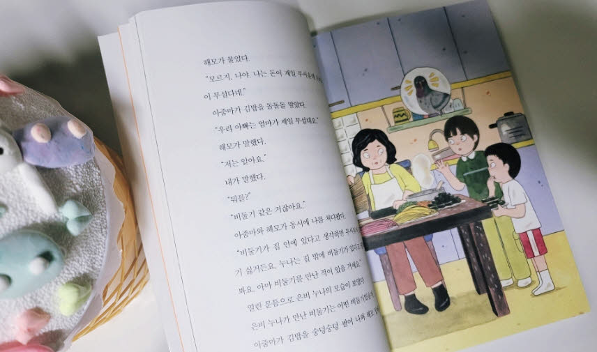 비둘기는 길에서 자주 만날 수 있는데 막상 내 눈앞에 나타나면 뒷걸음을 치게 됩니다. 한낮에 우리집 거실에 비둘기가 있다? 태구는 자신의 뺨을 내리칩니다. 태구는 이웃들을 기다린다에서 비둘기는 두려움이라는 상징을 가지고 있습니다. 누구나 두려움은 있고 그걸 이겨낼 용기와 위로가 있다는걸 알게 됩니다.