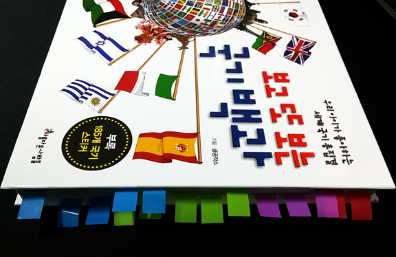 저는 약간의 흥미와 동기를 부여하기 위해 아들에게 다양한 색상의 포스트 잇을 이용해 가보고 싶은 나라의 국기, 멋있는 국기, 신기한 국기 등을 마음껏 표시해 보라고 주문했습니다. 재미있어 하더군요. 포스트 잇이 모자를 정도였죠.