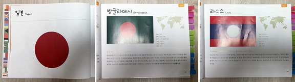 파란색은 비슷한 점이 많은 국기들입니다. 대한민국 다음에 나오는 일본 국기의 둥근 원을 짚어 내더군요. 그 다음은 영국의 국기였습니다. 영국의 식민지였던 나라가 주루룩 차례대로 나타나 왜 그런지 저에게 질문을 하기도 했습니다. (참고: http://planuhak.com/535 )