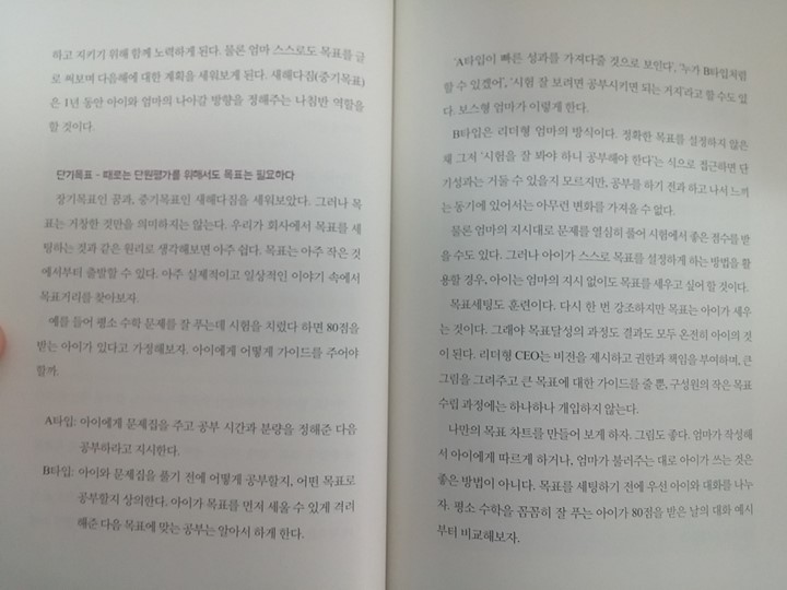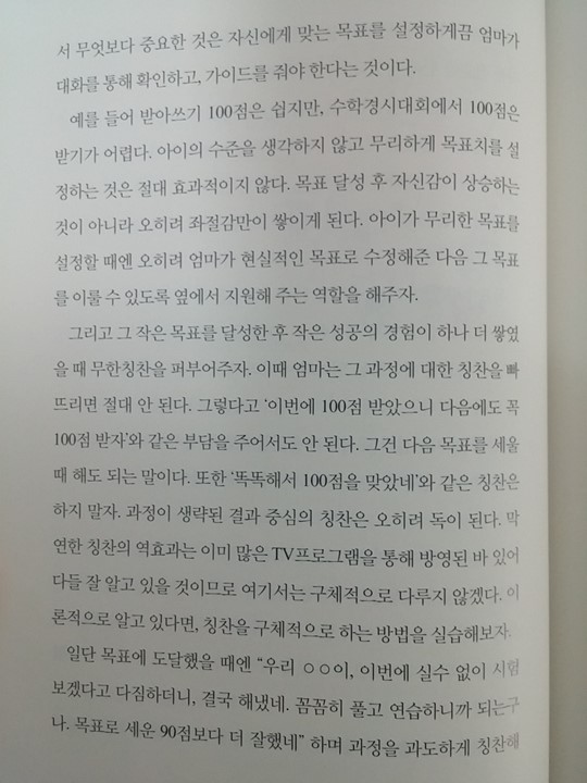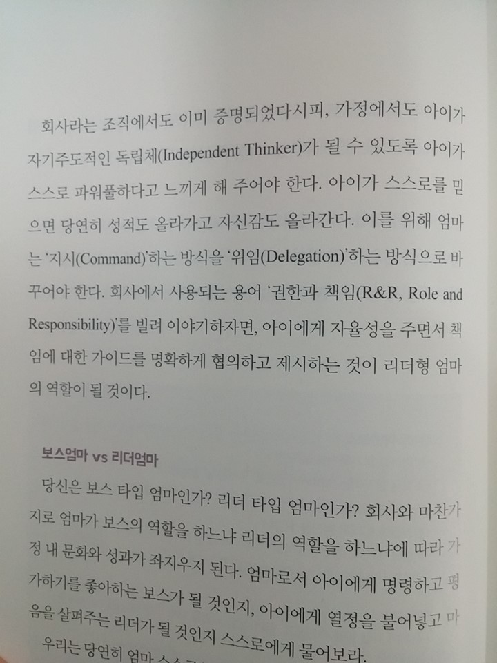 이 책을 다 보고 난 뒤 드는 생각은 과연 이 책이 육아서가 맞는가 하는 생각이 조금 들었다. 자기 개발에 대한 내용과 마케팅 업무 경험담을 예로 많이 다루고 있어서 그렇게 느껴졌던 것 같다. 누가 보더라도 매우 화려한 커리어와 경험담에 조금은 자격지심이 들었던 것도 사실이다.