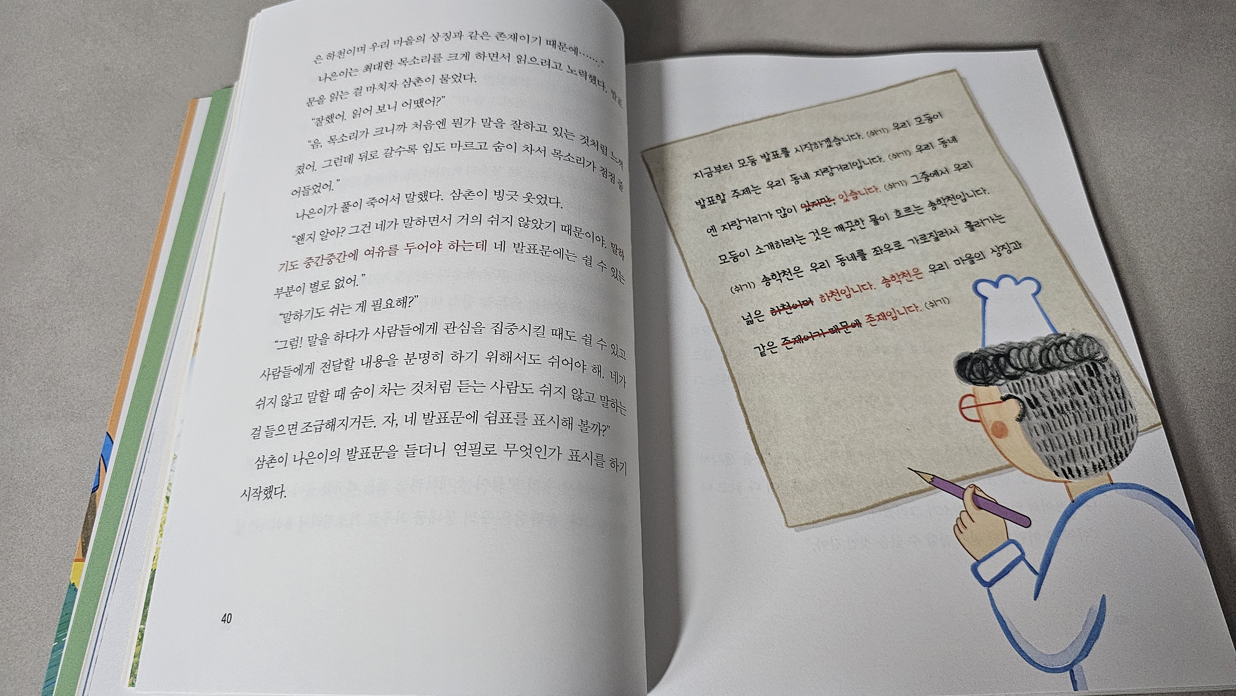 나은이, 현우, 소미가 각자의 말하기 고민을 털어놓으면 떡볶이 삼촌은 떡볶이를 만들다 말고 아이들의 눈높이에 맞게 각각의 공식적 말하기는 왜 하는지, 어떻게 말해야 하는지, 말할 때 어떤 점을 주의해야 하는지를 설명해 주고, 다음 장면에 올바른 방법으로 아이들 스스로 주도하는 새로운 말하기가 펼쳐지는 구성으로 되어 있는데, 전보다 눈에 띄게 달라진 주인공 아이들의 변화는 잘 말하고 싶고 말하기 방법을 제대로 배우고 실천해 보고 싶은 어린이 독자들에게 큰 성취감과 용기를 심어 줄 것같아요.