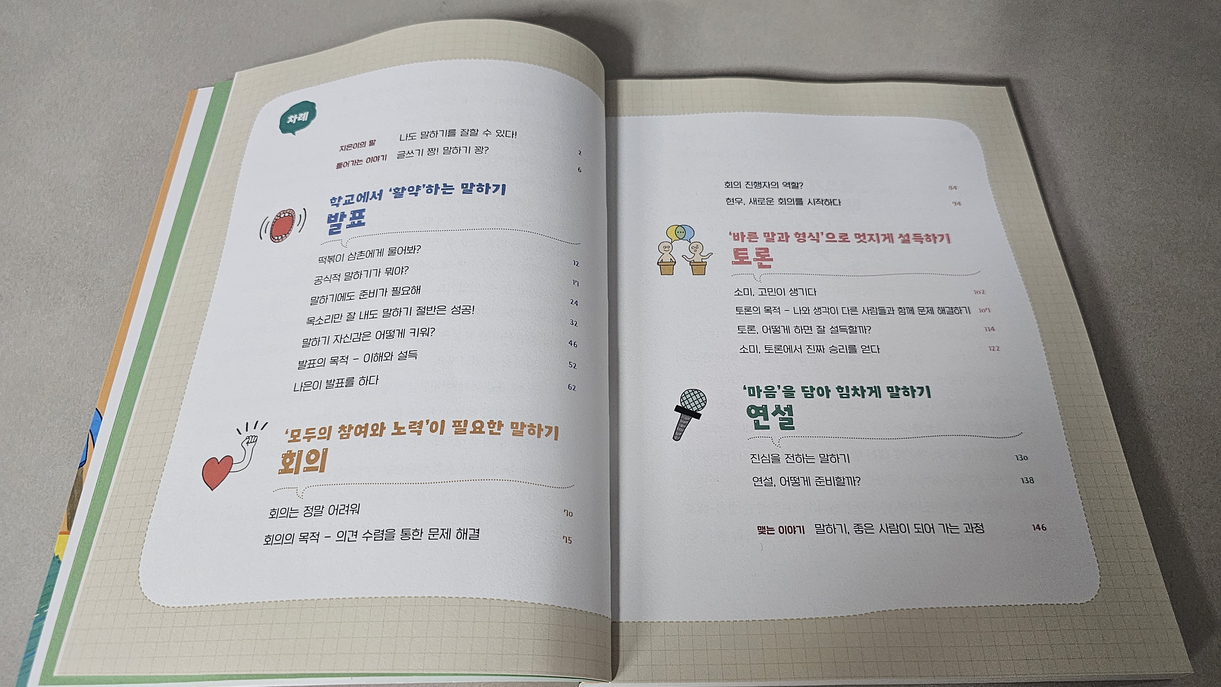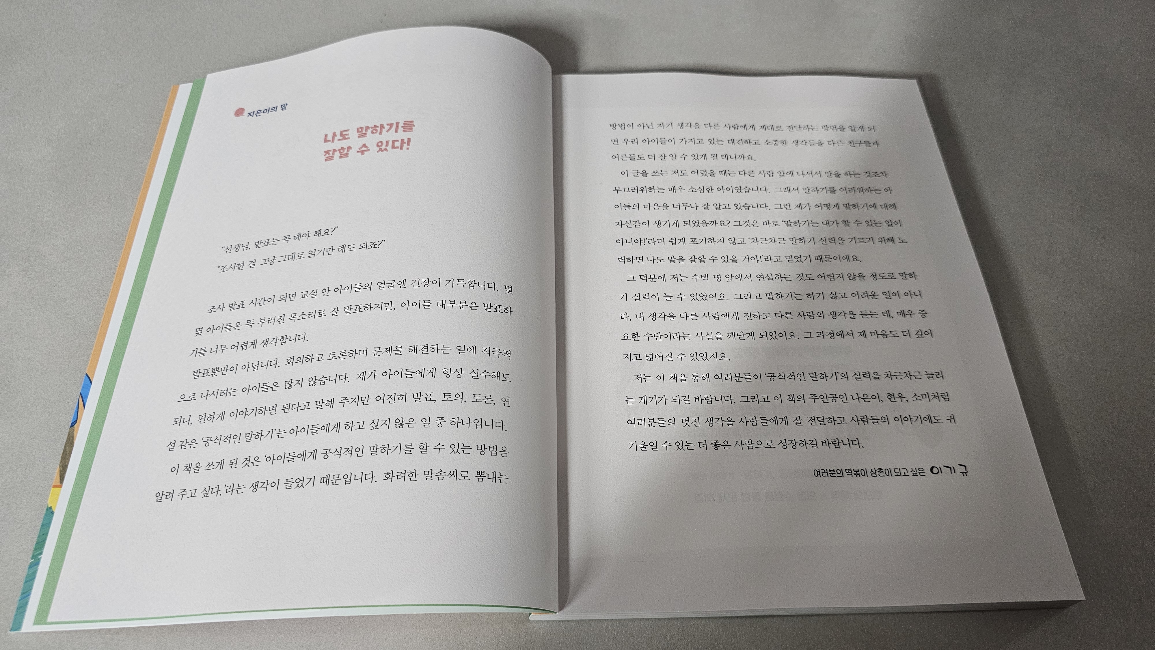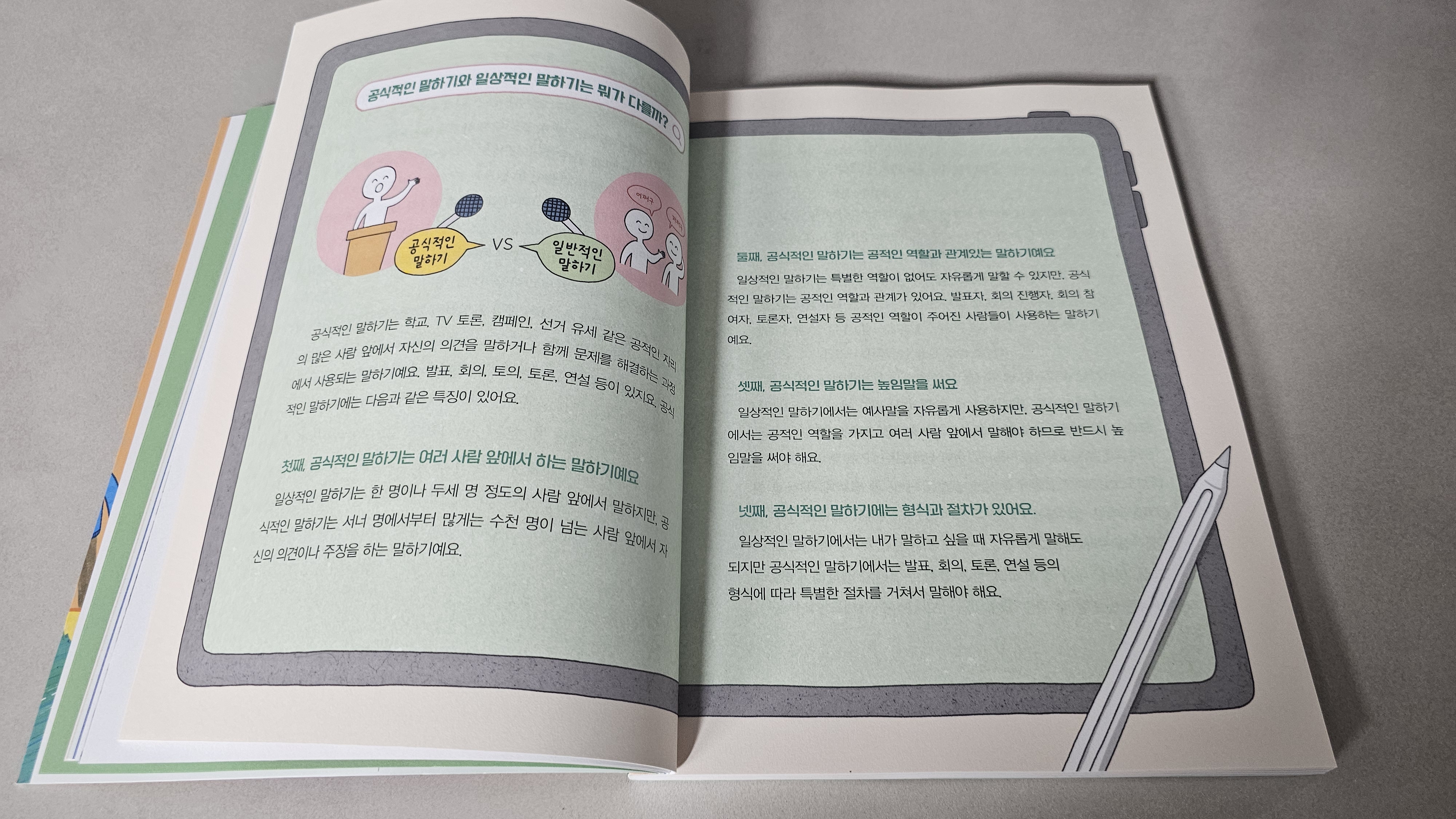 특히 이 책은 공식적 말하기 중에서도 어린이들이 앞으로 학교나 사회에서 훨씬 더 많이 접하게 될 발표, 회의, 토론, 연설을 다루고, 실전에서 활용하고 응용할 수 있는 도움 글을 알차게 담아서 실생활에 적용해 볼 수 있어 더 좋은 것 같아요.