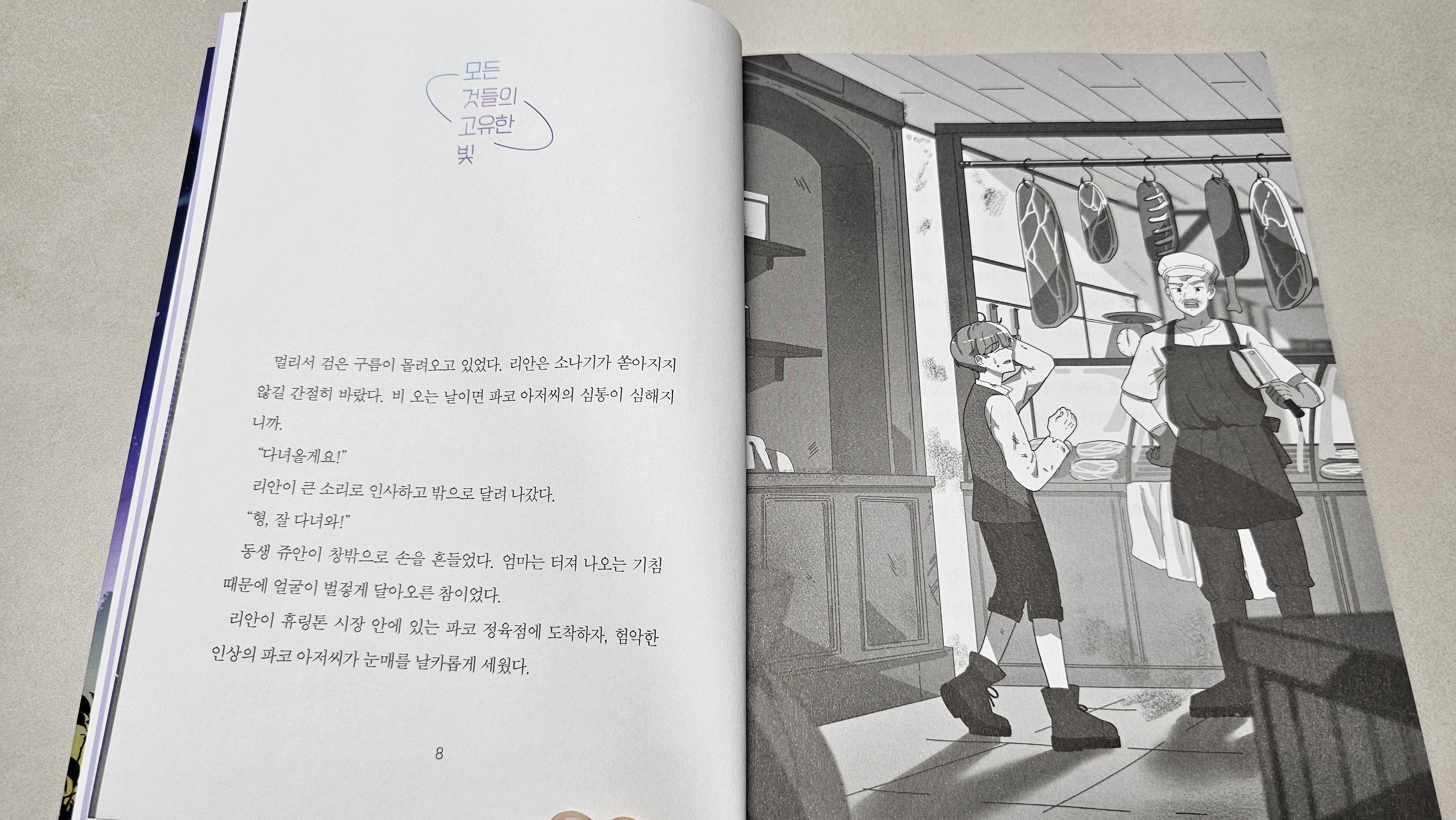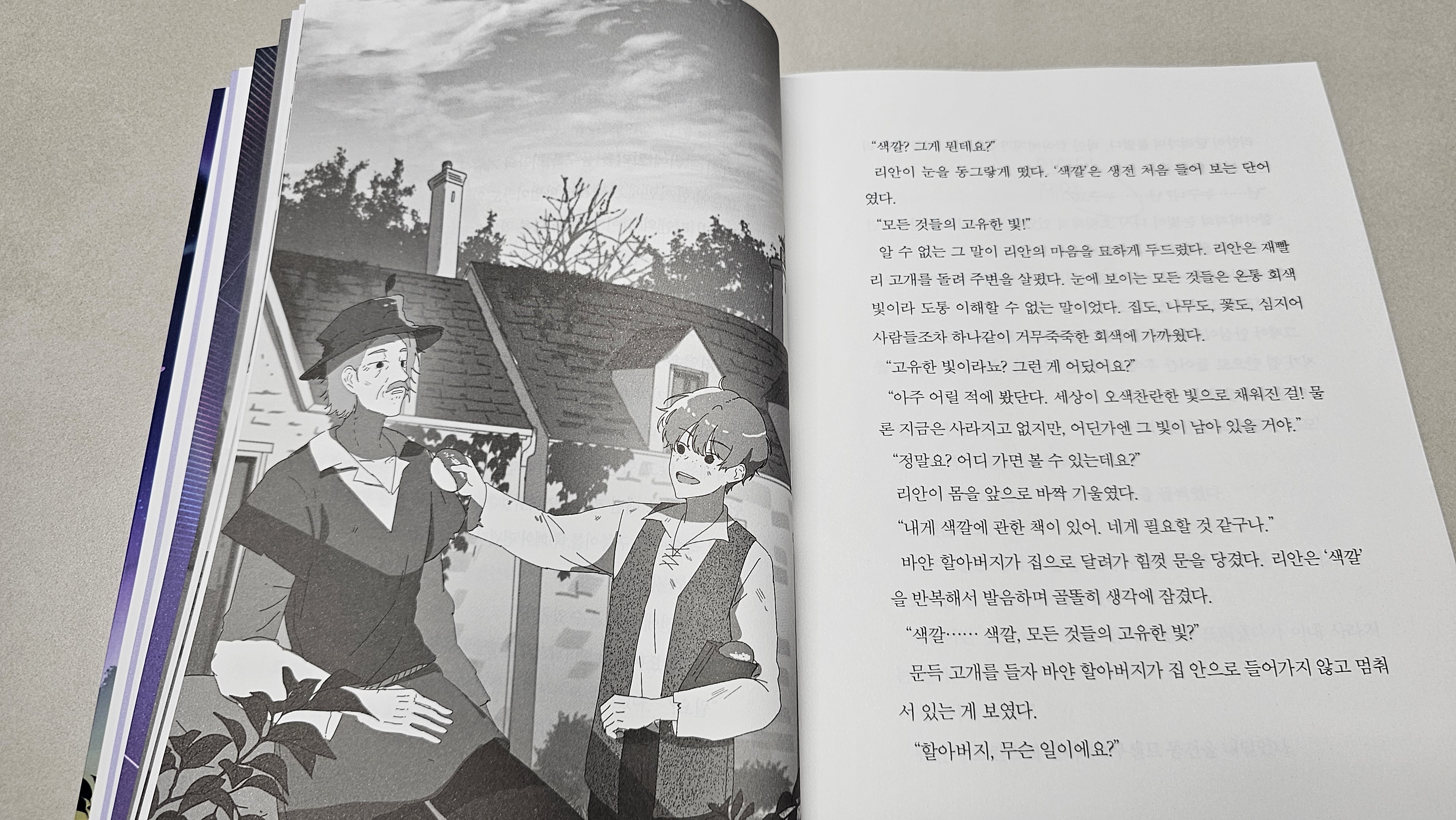 책장을 한 장 한 장 넘길 때마다 우울한 흑백의 세상에서 생동감 넘치는 컬러의 세계로 초대받는 느낌이 들 거예요.