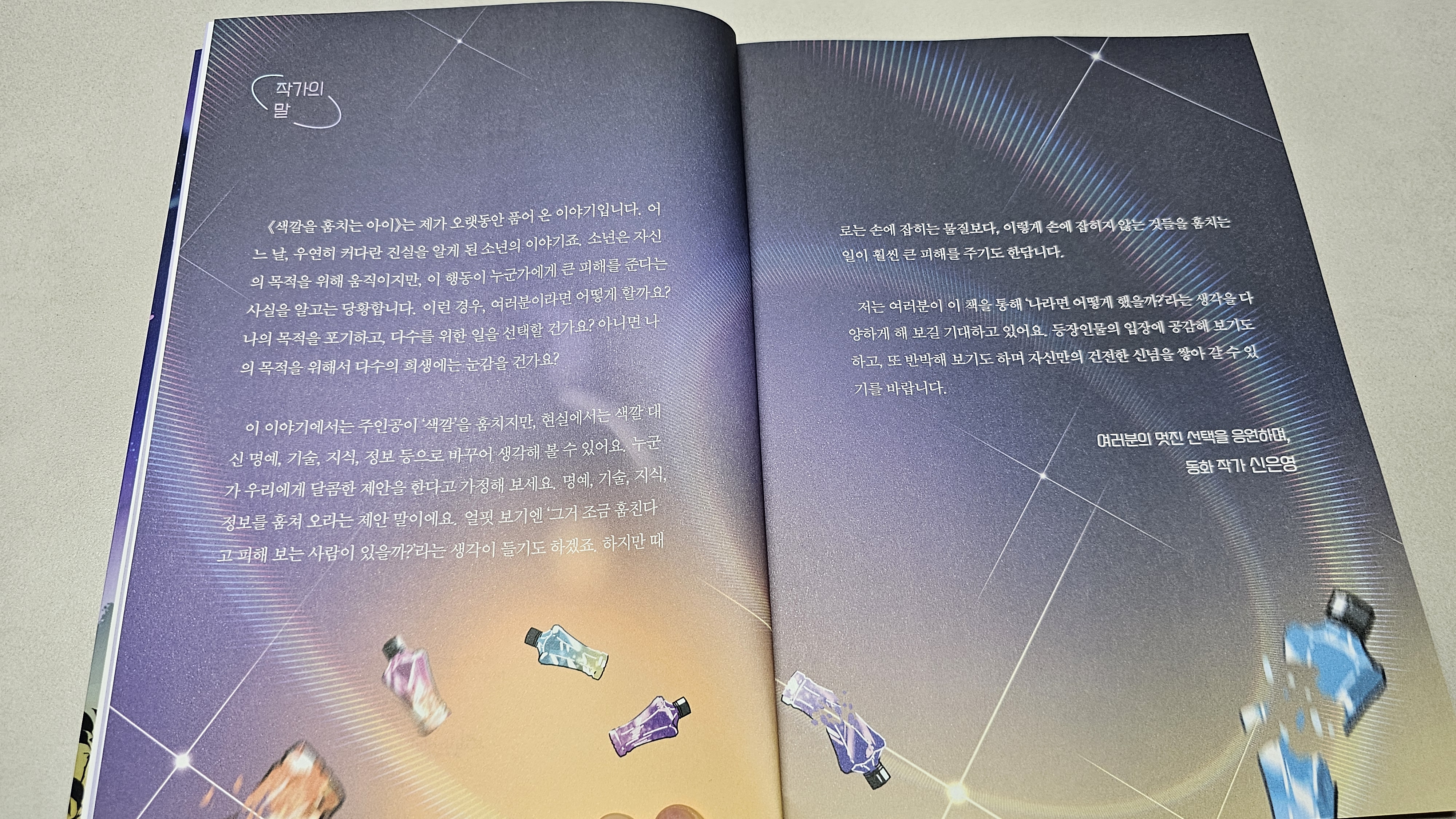 이 책 《색깔을 훔치는 아이》를 통해 어린이 독자들이 자신만의 건전한 신념을 쌓아 가며 멋진 선택을 할 수 있기를 응원하는 마음을 가득 담아 집필하셨답니다.