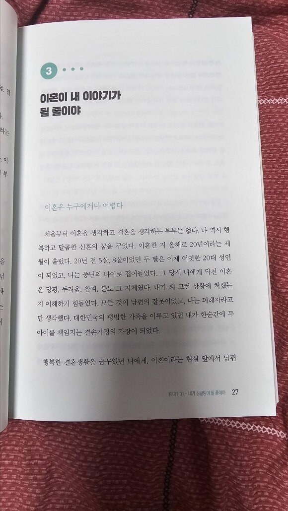이혼을 경험한 돌싱 남녀들에게 작가 자신이 살아온 경험을 솔직하게 나누며, 이혼 당사자들뿐만 아니라 그들의 부모님이나 자녀들에게도 세상을 헤쳐나갈 희망과 용기를 건네는책이기도 합니다.