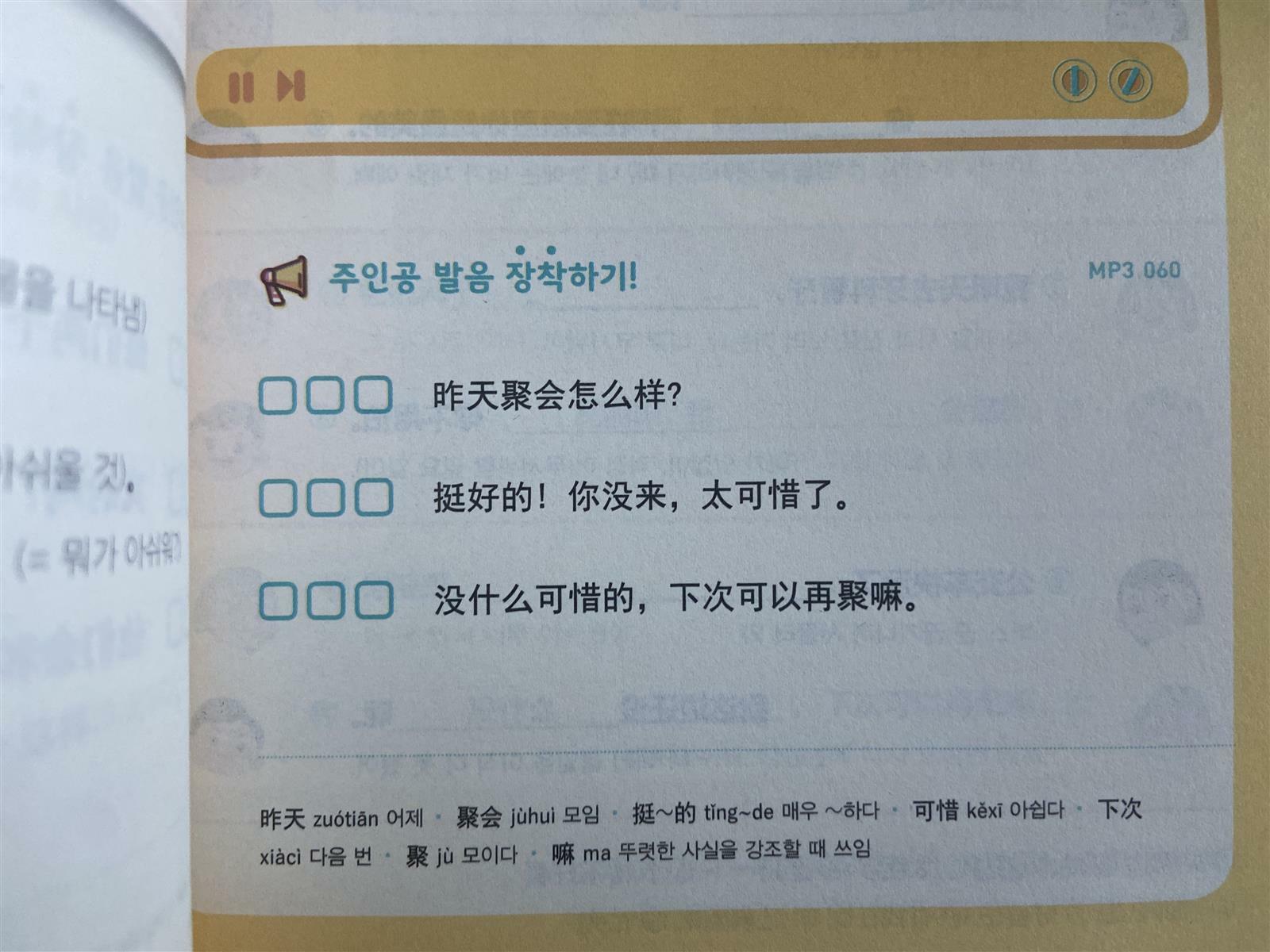 실제 대화와 성조 없이 연습할 수 있는 부분으로 구성되어 있습니다.