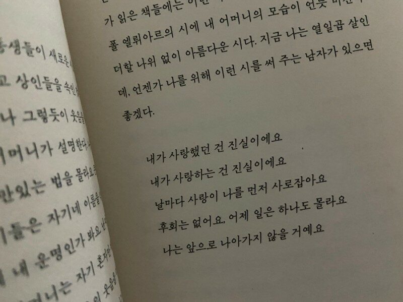 화자의 양가감정을 가장 잘 드러낸 부분이라 느껴진 67쪽이다. 이미 원천 차단한 행복 중 하나인 그의 태어나지 않은 아이를 제외하면 전 아내와의 만남은 인간으로써 행복을 추구했던 유일한 순간이다. <태어나지 않은 아이를 위한 기도>에서도 가장 많이 등장하는 전 아내는 화자 본인이 가장 바랐던 운명이었다. 그래서 유독 전 아내가 언급되는 장면에는 연속적인 조건문들이 등장한다. 만약 내 어린 시절이 조금 더 행복했더라면, 만약 그 카페에서 우리가 만나지 않았더라면, 만약 내가 유대인이 아니었다면, 만약 그녀가 유대인이 아니었다면......