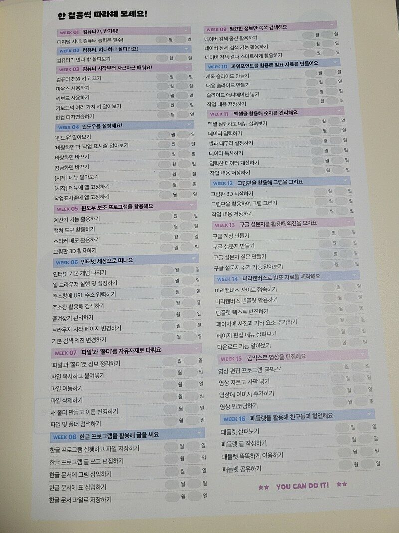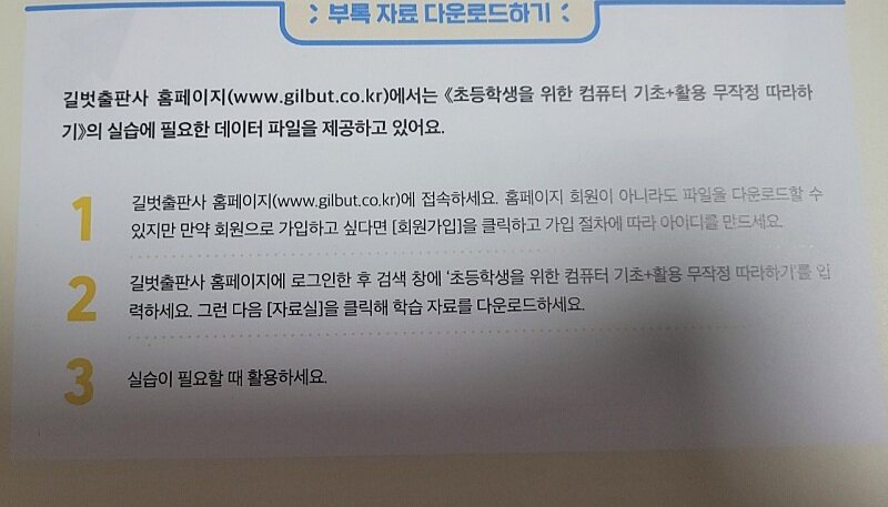 학교숙제로 컴퓨터를 접해야하는 상황에서 뭔가 기초를 잡고 스스로 따라서 해볼수 있는 교재가 없을까 고민하던차에 반갑게 만나보게 된 초등학생을 위한 컴퓨터 기초 활용 무작정 따라하기~~~^^ 컴퓨터에 대한 아주 기본적인 정보와 컴퓨터를 끄고 켜기부터 현직 초등학교 선생님들이 학교 숙제와 수행평가에 단골로 등장하는 예제만 골라 선생님의 설명을 차근차근 따라하다 보면 학교 숙제에 꼭 필요한 노하우를 얻을 수 있어요~~ 필요한 내용만 쏙쏙 찾을 수 있는 인터넷 검색 꿀팁부터 파워포인트, 한글 등 문서 프로그램 활용법, 영상 제작 방법까지 한 권에 ~~ 학교 숙제에 활용할 수 있는 한글, 파워포인트 템플릿도 제공하므로 학습 효과가 높답니다~~ 방학동안 부담없이 따라하다보면 컴퓨터 활용 실력이 쑥쑥~~늘것 같아요~~^^ 실습에 필요한 데이터파일도 제공해줘서 너무 좋으네요~~ #초등컴퓨터#길벗#기초컴퓨터#컴퓨터활용