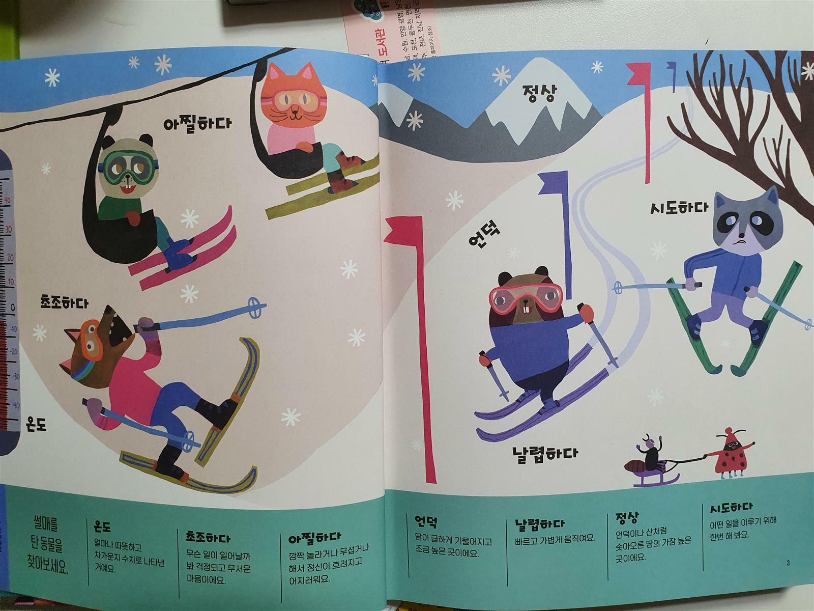그리고 난 다음에는 제가 그 페이지에 나오는 단어와 서술어들을 다 넣어서 하나의 이야기를 만들어 들려주었습니다. '오늘은 동물친구들이 스키장에 갔어요 기니피그와 너구리는 벌써 정상에 올라가서 스키를 타고 있네요 너구리는 멋진 묘기를 시도했고 기니피그도 날렵하게 눈 덮힌 언덕을 내려갔어요.... ' 이야기를 들려주니 아이가 좀 신기해 하면서도 재미있어 하는 모습이었습니다.
