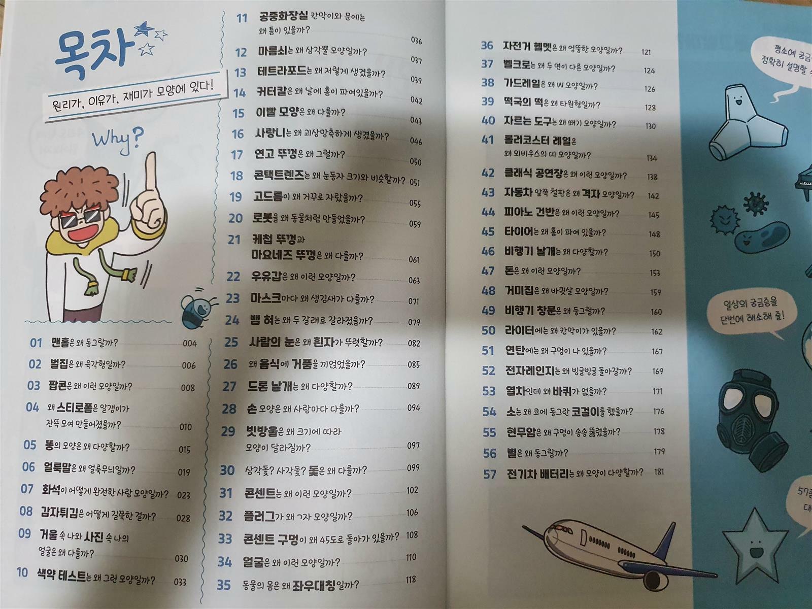 무려 57가지 질문이 나와있구요, 목차를 보면서 생각지도 못했던, 정말 궁금해본 적이 없는 것들에 대한 질문들이 있는 걸 보면서 진짜? 왜 그런 모양인거지? 이유가 있었던 거야? 하는 호기심이 저조차도 막 생겼습니다. 그리고 목차에도 나와있듯이 질문의 범주도 다양한 과학(생물, 지구과학, 물리, 화학)이 다 포함되어 있고 특히 실생활과 관련된 물건들에 대한 질문들도 있어서 좋았습니다.