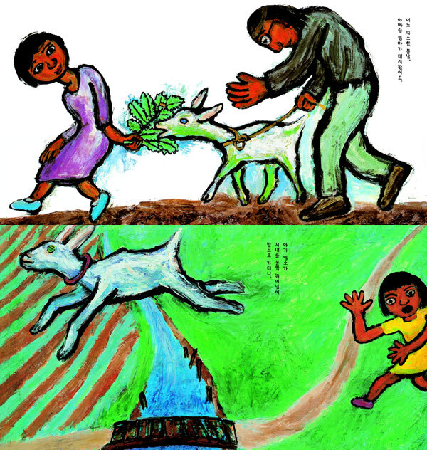 이향안 작가의 전작인 <팥쥐일기>는 배현주님의 그림이 미워할 수 없는 사랑스런 팥쥐 ‘아주’를 만들어주셨다면 <채채의 그림자 정원>은 호랑님의 그림이 이야기를 완성한다. <책과 노니는 집>이 김동성의 그림으로 완성된 것처럼 말이다. 천주교가 탄압받던 시절의 필사쟁이 장이의 이야기 <책과 노니는 집>과 조선왕조실록을 지켜내려는 사람들의 이야기 <채채의 그림자 정원>은 역사동화라는 공통점 말고도 멋지다는 찬사가 부족할 정도로 빛나는 그림작가가 든든하게 버티는 작품들이다. 그림의 분위기가 닮은 듯 다른 느낌을 준다. <책과 노니는 집>의 김동성의 그림이 잘 가꿔진 정원처럼 차분하고 단정한 느낌이 든다면 <채채의 그림자 정원>의 호랑의 그림은 산과 들의 거침없는 수목들처럼 자유분방하고 역동적인 느낌을 준다. 이런 느낌은 아마도 물감이 튀고 번지는 화법이 주는 자유로움이 아닐까 싶다. 단정한 그림에서도 윤곽선을 뚫고 나오려고 꿈틀대는 자유가 느껴진다. 오래 전에 만났던 호랑 작가의 <호랑이가 준 보자기>에서도 인상적으로 느꼈는데 ‘번짐의 미학’을 자유로움으로 구현하는데 탁월한 작가가 아닐까 싶다.