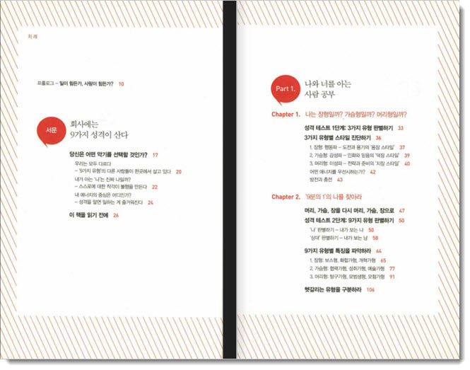 서문에서는 성격이 얼마나 중요한지에 대해 설명하고 이어지는 1부에서는 나와 주변 사람들의 성격 유형을 찾는 테스트를 한다.