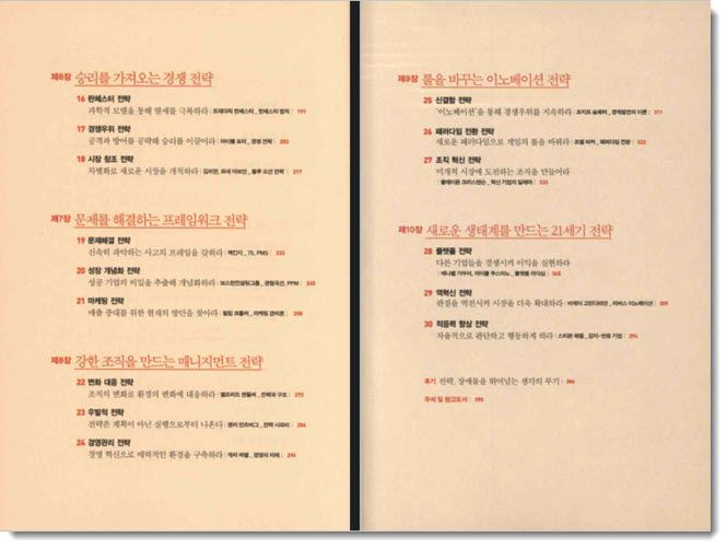 이 책은 총 10장으로 구성되어 있으며 각 장마다 3명씩 모두 30명의 전략가들의 탁월한 전략을 소개하고 있다. 제1장 리더십 전략을 시작으로 군사 전략, 효율화 전략, 실행력 강화 전략, 목표 달성 전략, 경쟁 전략, 프레임워크 전략, 매니지먼트 전략, 이노베이션 전략, 21세기 전략 등 10개의 전략에 대해서 이야기 한다. 장 구성에서부터 이 책의 '전략'이 느껴진다. 미처 알지 못했던 새로운 개념의 전략들도 대거 소개되고 있다.