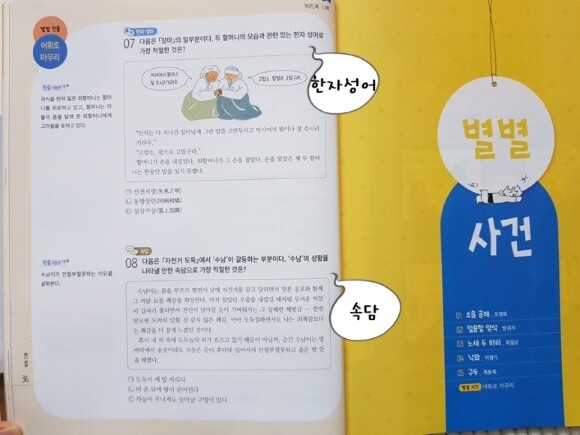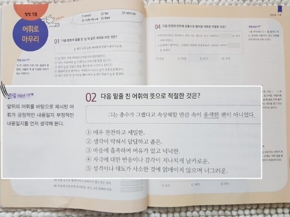 이렇듯 예문을 통해 어휘를 확인하는 문제들이라 힘들어 하지 않고 효과적인 어휘학습이 가능한것 같아요.