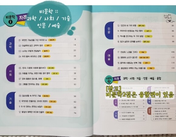비문학은 총 2권으로 구성되어 있는데, 각 권 20개의 지문이 수록되어 있습니다. 특히 2권은 융합영역에 지문이 5개 구성되어 있네요!