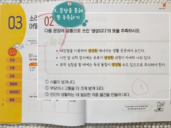 아이들은 처음보는 글에서 모르는 어휘가 나오면 당황하기 마련이고 그런상황에서 독해가 제대로 될수가 없겠지요. 하지만 이렇게 문제들을 통해 어휘의 뜻을 추측하는 방법을 배우고, 또한 문제의 어휘들을 더불어 학습할 수 있겠습니다.