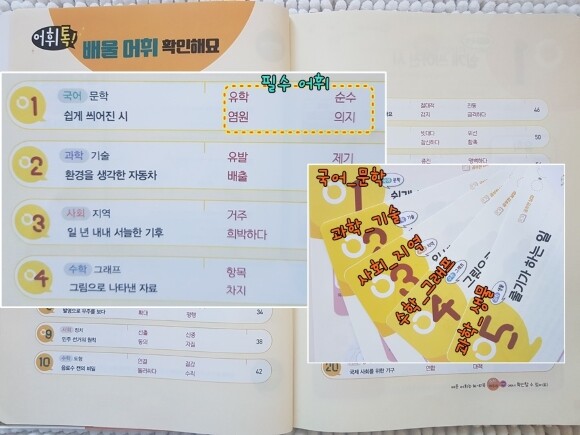 사회용어 과학용어 수학용어 교과를 배울때 조금씩 건드려주고 있지만 요즘은 문제들을 살펴보면 어휘실력이 문제 풀이의 키를 쥐고 있다는 생각이 들더라구요.