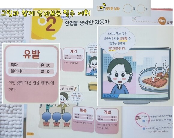 2일차 학습에서 유발(誘發) 제기(提起)단어를 학습하고, 그림에서는 이 어휘를 활용하여 [소시지, 햄과 같은 가공육이 암을 유발할 수 있다는 문제가 제기되었습니다.]라는 예문을 제시하고 있네요. 이 처럼 그림과 한자를 통해서 필수 어휘를 학습 할 수 있지요.