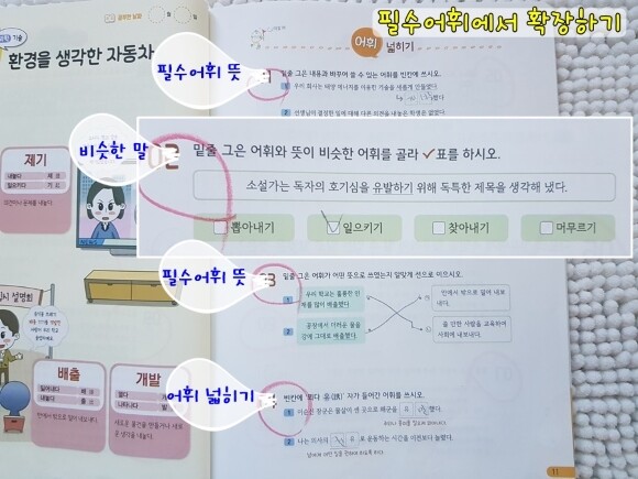 어휘넓히기는 앞내용의 흐름을 이어 어휘를 확인하는 과정이라고 생각하면 좋을것 같아요. 아이들이 까다로워 하는 부분은 아니랍니다!
