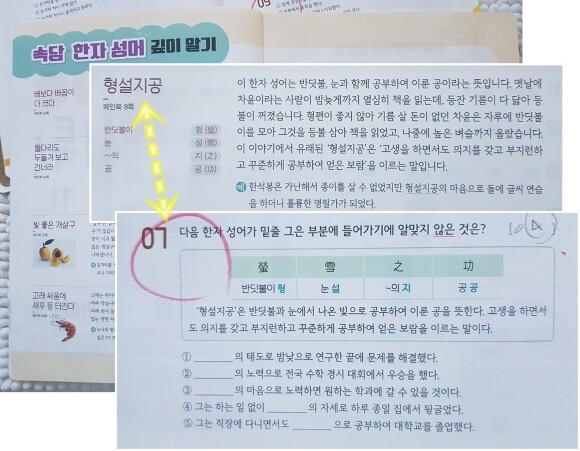 문제와 함께 다시 비교 해보았습니다. 아이가 이젠 형설지공이란 한자성어만큼은 자신있게 이야기 할 수 있을것 같다고 하네요! 반복과 깊이있는 학습에서 오는 효과란 생각입니다.