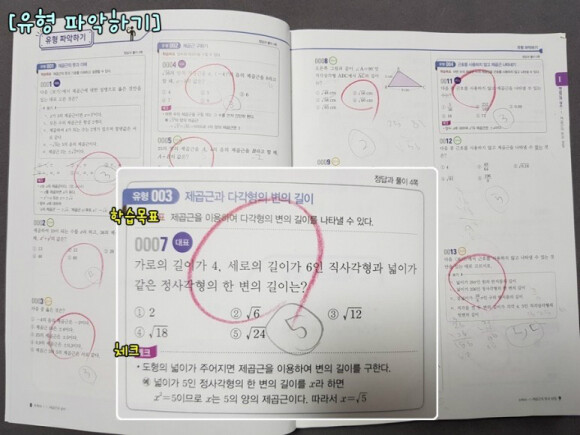 처음은 유형파악하기 입니다. 유형교재에서 제일 중요한것은 유형파악하기겠지요! 유형마다 학습목표가 있고, 대표문제와 함게 체크해야 할 사항이 자세히 설명되어 있습니다. 대표문제를 틀릴수는 없을것 같아요. ㅎㅎ 그리고 또한 그냥 문제 풀기만 할수도 있지만 체크 부분을 꼭 한번은 살펴보면서 학습하면 유형파악하기 부분은 손쉽게 끌리어 할수 있을것 같습니다.