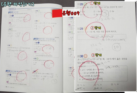 유형009번을 보면 알수 있듯이 유형 하나에 1,2,3 단계 문제가 제공되고 있는데 어떤 유형은 1,2단계까지만 있기도 해요. 조금 쉬운 유형은 1,2단계문제만 까다롭고 어려운 유형은 2,3단계 문제만 이런식으로 유형에 따라 문항수가 조절되어 있습니다.