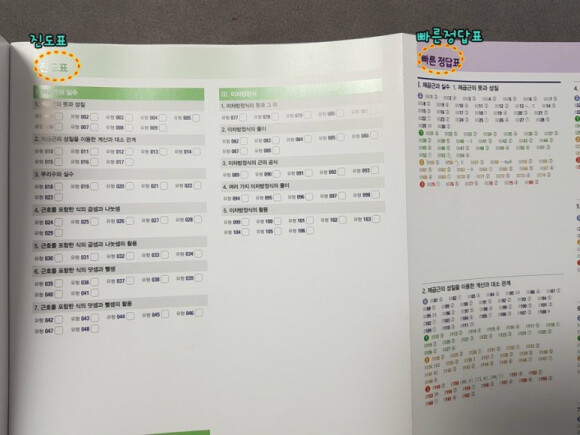 책장을 딱 펼치면 제일 먼저 나오는것이 진도표와 빠른정답표입니다.