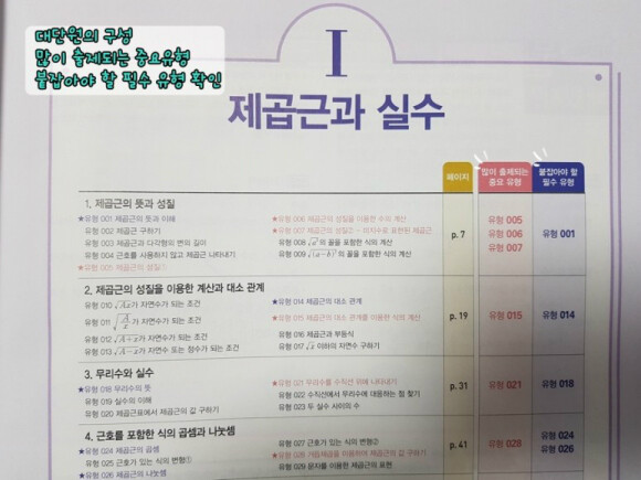 대단원의 구성과 함게 많이 출제되는 중요 유형과 붙잡아야할 필수 유형을 표기해 두었어요. 유형문제집으로서 학습자에게 전달해주고 싶은 메시지를 가득 담고 있는 페이지입니다. 학습전에 쭉 훑어 보면서 소단원과 유형들까지 차근차근 살펴보고, 주요 유형은 따로 체크해보는것도 좋을것 같아요.