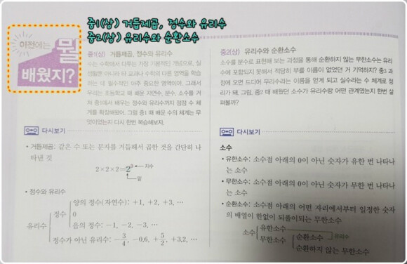중1(상)에서는 거듭제곱과 정수와 유리수 부분, 중2(상)에서는 유리수와 순환소수에 대해 배웠고 그 내용을 복습 할수 있지요.