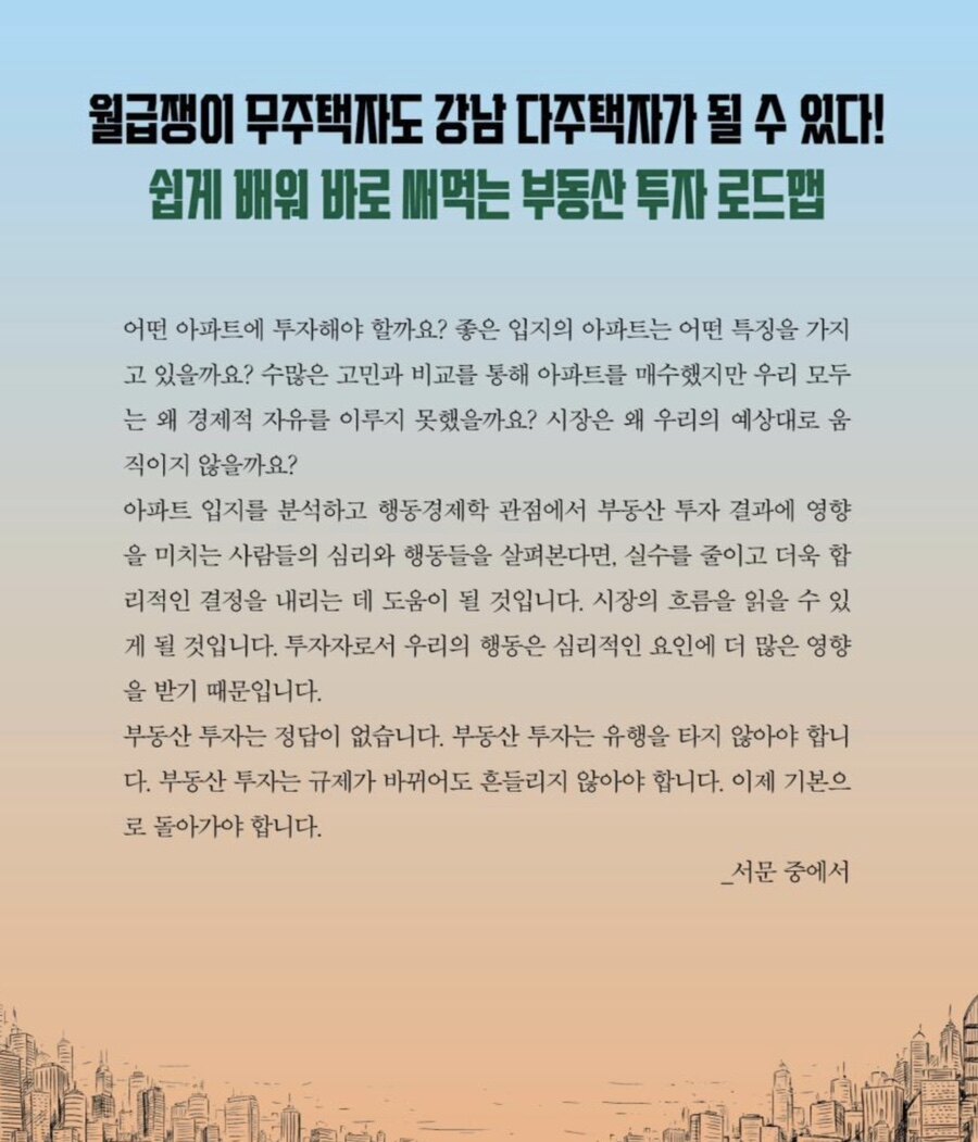 기본으로 돌아간다는 말은 과거로 후퇴하자는 의미가 아니다. 흔들리지 않을 기준을 다시 세우자는 제안이다. 초보자에게는 방향을 잡아주고, 경험자에게는 스스로를 점검하는 체크리스트가 된다. 부동산 투자에서 가장 어려운 것은 정보를 얻는 일이 아니라, 그 정보를 걸러내는 기준을 갖는 일이다. 시장이 어떤 방향으로 흘러가든, 이 책이 강조한 기본은 변하지 않는다. 그리고 그 변하지 않는 기준이 결국 투자금을 지켜준다. 월급만으로는 집을 살 수 없는 시대에, 우리는 투자해야 한다. 부자가 되기 위해서가 아니라, 뒤처지지 않기 위해서. 그리고 그 투자의 출발점은 기본이다.