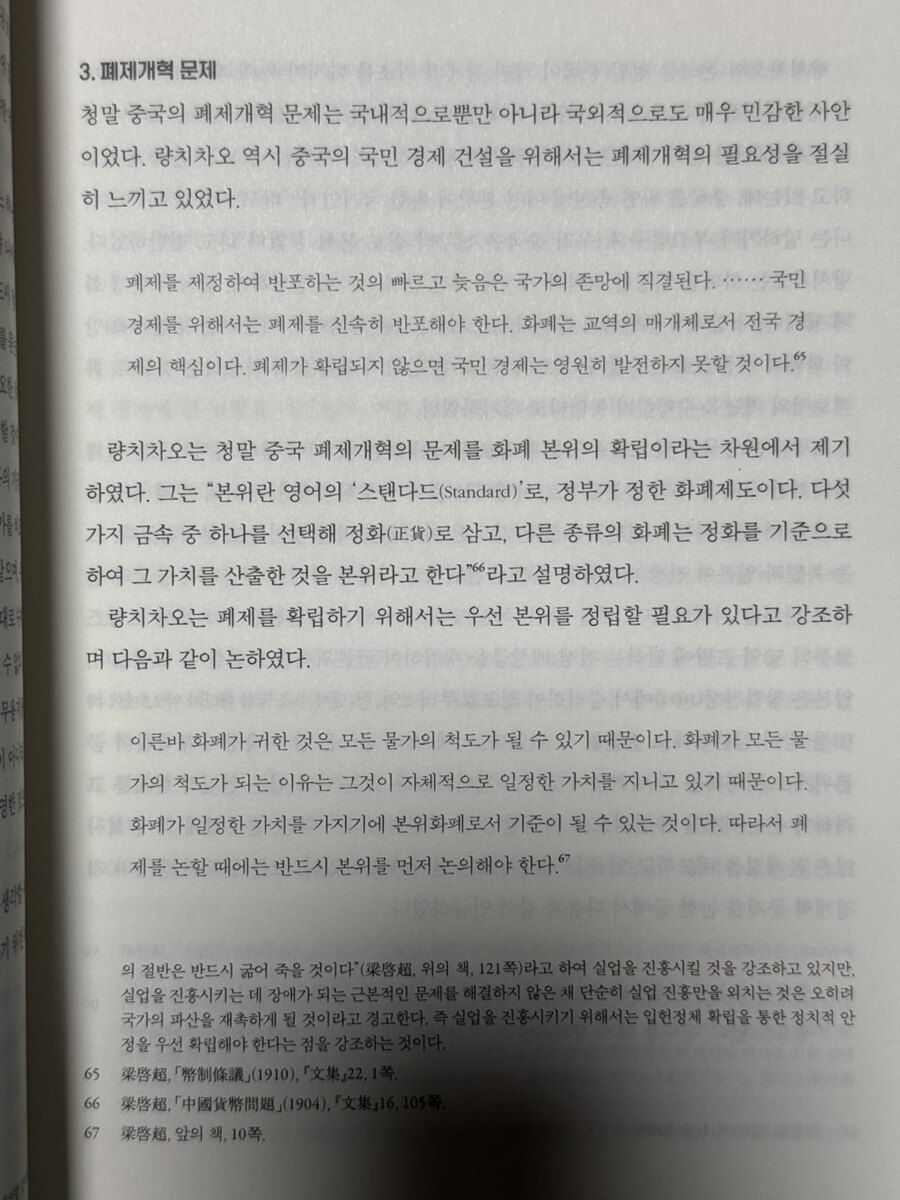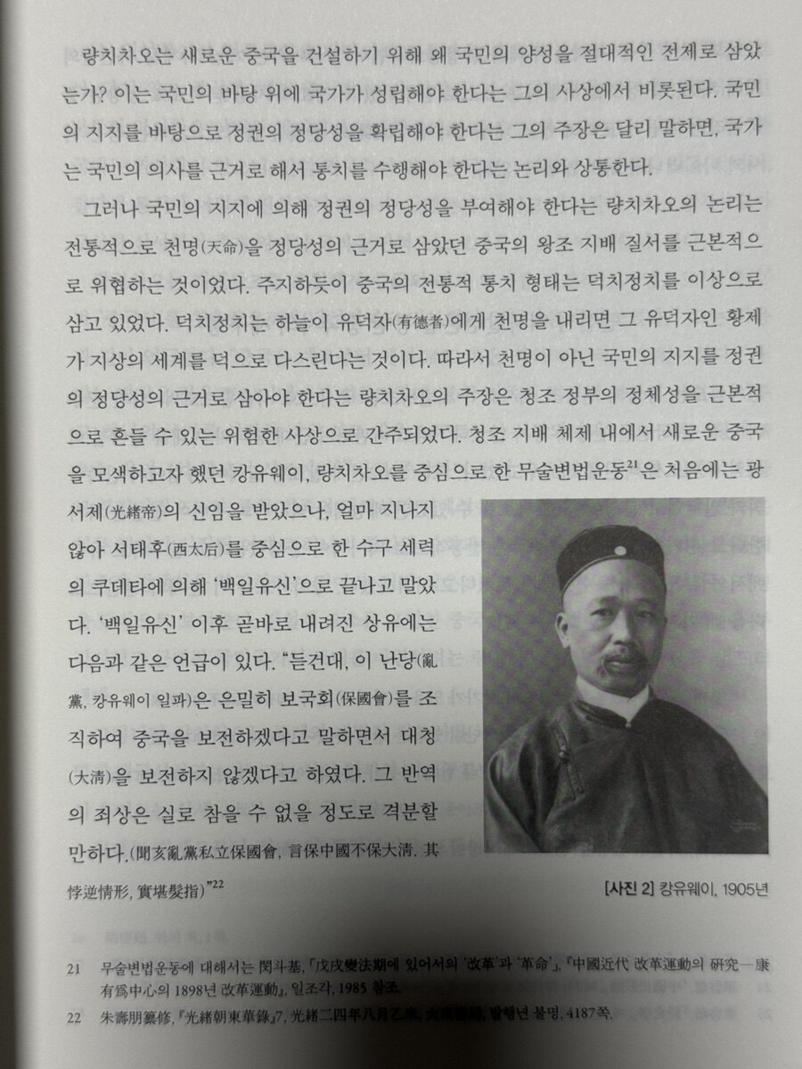 책을 읽으며 나는 현재 중국의 여러 모습이 량치차오 시대의 고민과 연결되어 있음을 느꼈다. 강력한 중앙집권, 국가주의적 민족주의, 경제 발전을 통한 국가 강화, 주변부에 대한 통합 의지. 이 모든 것이 백여 년 전 량치차오가 씨름했던 문제들이다. 중국은 여전히 '탄생'하고 있는 중이다. 제국의 유산과 국민국가의 요청 사이에서, 보편주의와 민족주의 사이에서. 량치차오를 보수 개량주의자로만 치부하는 것은 그의 사상이 지닌 복잡성을 놓치는 일이다. 그는 혁명과 보존, 전통과 근 대, 제국과 국가 사이에서 제3의 길을 모색했다. 그 길이 성공했는지는 논쟁적이지만, 그 시도 자체가 근대 중국 형성 과정의 핵심이었다. 중국의 탄생은 일회적 사건이 아니라 지속적 과정이며, 량치차오는 그 과정을 설계하고 추동한 건축가 중 한 명이었다. 우리가 량치차오를 읽어야 하는 이유는 국가란 무엇이고, 국민이란 누구이며, 정치는 무엇을 위한 것인가 하는 근본적 질문을 다시 던지기 위해서다. 량치차오의 분투는 끝나지 않았다. 그것은 여전히 중국 안에서, 그리고 동아시 아 전체의 질서 속에서 계속되고 있다.
