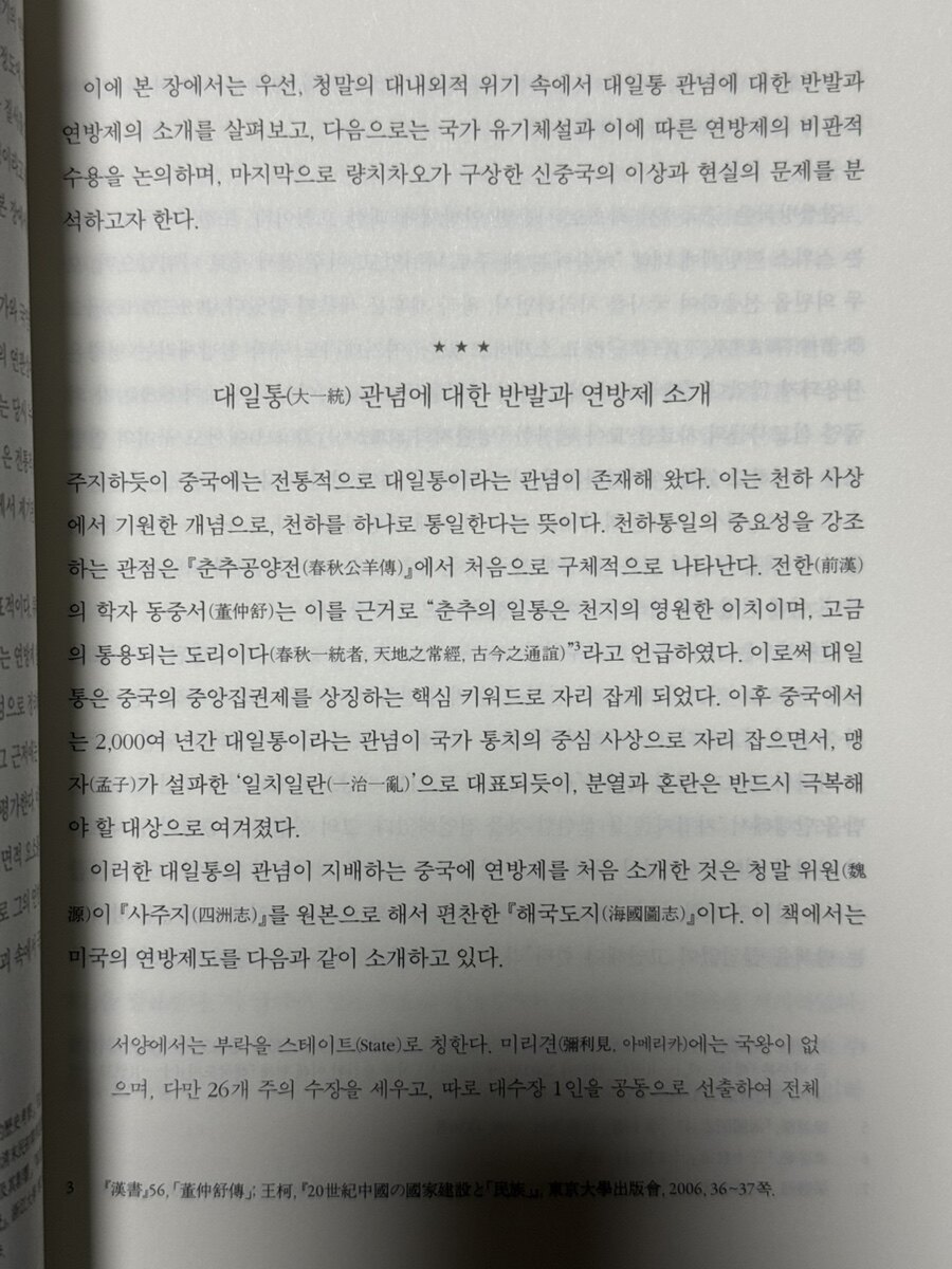 동북지역 조선인의 법적 지위 문제는 이 혼란을 극명하게 보여준다. 중국은 만주 개척을 위해 조선인을 받아들였다가, 일본과의 갈등이 불거지자 그들을 귀화시키려 했다. 일본은 조선인을 자국민으로 규정하면서도 권리는 주지 않고 의무만 부 과했다. 조선인은 두 제국 사이에서 어느 쪽 국민도 온전히 될 수 없는 상태로 남겨졌다. 국민이라는 범주가 얼마나 자의적이고 정치적인지, 그리고 그 경계에 선 사람들이 얼마나 취약한지를 적나라하게 드러낸 사례다. 량치차오의국성론은 이런 맥락에서 이해할 필요가 있다. 그는 외부 충격과 내부 규범의 상실 속에서 방황하는 중국인에게 새로운 정체성을 부여하려 했다. 국성이란국민으로서의 본성, 즉 집단적 성격을 의미한다. 이는 개인의 자유보다 국가의 생존을 우선하는 국가 주의적 발상이지만, 동시에 해방의 가능성도 내포하고 있다고 저자는 분석한다. 량치차오는 민족주의를 통해 국가를 강화하되, 그것이 궁극적으로는 보편적 질서로 나아가야 한다고 보았다. 이 긴장이 바로 근대 중국이 안고 있는 근본적 모순이다.