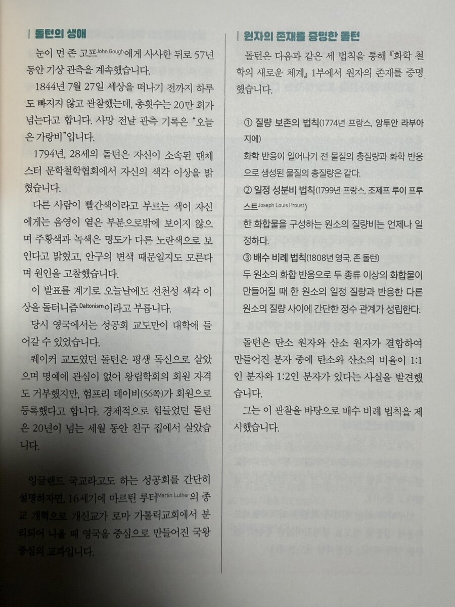책에서 가장 인상적인 점은 '틀렸던 이론'도 함께 다룬다는 것이다. 예를 들어 플로지스톤설. 오늘날 우리는 연소가 산소와의 결합이라는 것을 알고 있다. 하지만 18세기 과학자들은 물질이 탈 때 '플로지스톤'이라는 불의 원소가 방출된다고 믿었다. 캐번디시는 수소를 발견하고도 그것을 '플로지스톤 기체'라고 불렀다. 그의 관점에서는 그것이 가장 합리적인 설명이 었다. 그런데 라부아지에가 등장하면서 상황이 바뀐다. 그는 연소 과정을 정밀하게 측정했고, 질량 보존의 법칙을 발견했다. 플로지스톤설로는 설명할 수 없는 현상들이 속속 드러났다. 하지만 라부아지에의 이론이 즉시 받아들여진 것은 아니었다. 오랫동안 화학계는 두 설명 사이에서 갈등했고, 논쟁했고, 때로는 감정적으로 대립했다. 과학은 진공 속에서 정답을 찾는 과정이 아니라, 사람들 사이에서 '더 나은 설명'을 고르는 과정이었다. 이 대목에서 생각한다. 과학은 결국 인간의 언어로 쓰인 이야기라는 것을. 틀린 이론도 그 시대의 언어였고, 다음 세대는 그 언어를 수정하고 확장하며 조금씩 진실에 가까워졌다. 화학은 완벽한 사람들의 업적이 아니라, 불완전한 사람들이 끝까지 질문을 놓지 않았기에 만들어진 학문이었다.