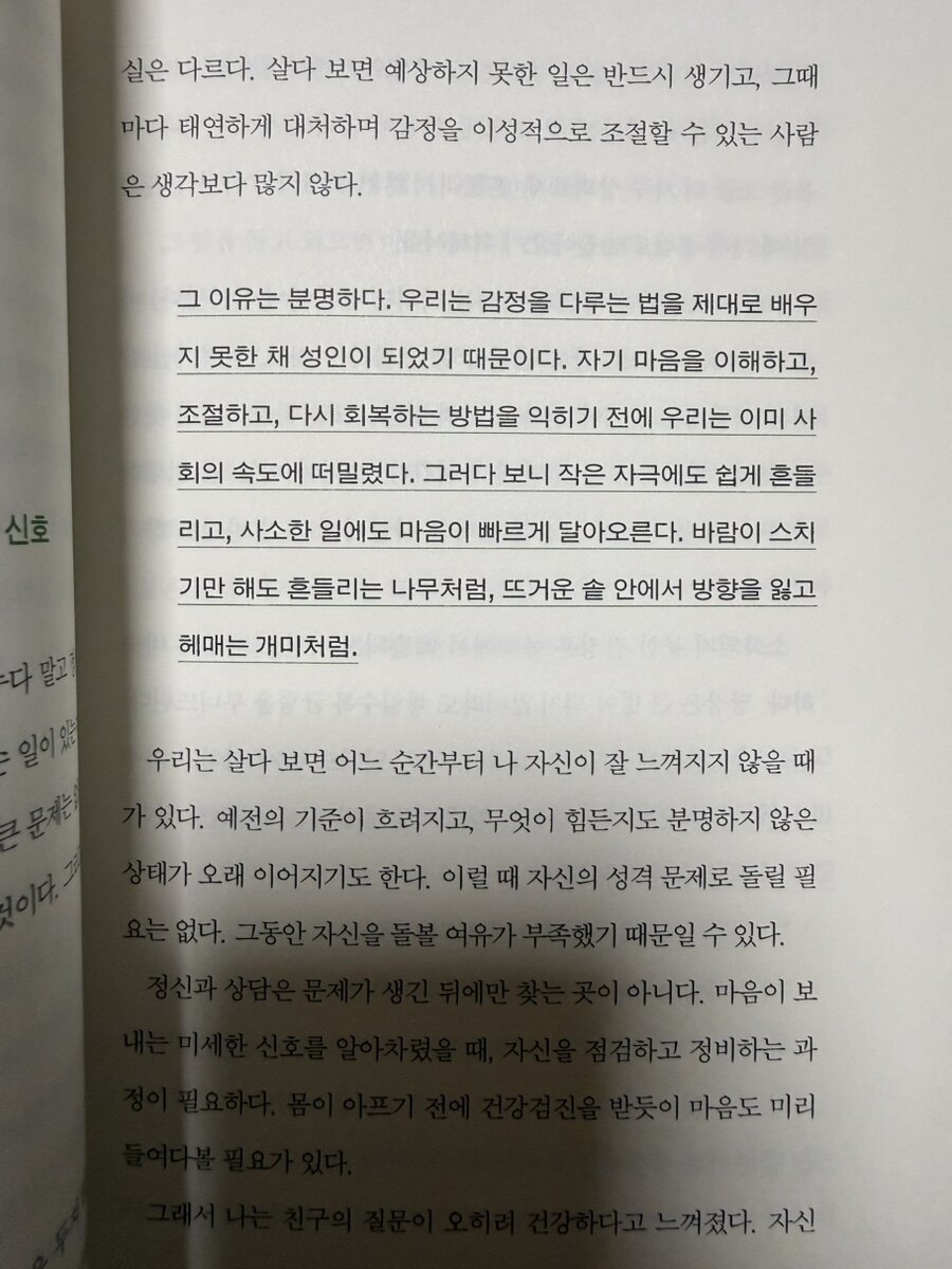 나는 이제 마시멜로를 보면 예전처럼 참아야 한다는 생각보다, 먹고 싶은지 아닌지를 먼저 묻게 됐다. 욕구를 프레임 밖으로 밀어내기 전에, 그 욕구가 나에게 무슨 말을 하고 있는지 들어보려 한다. 물론 그렇다고 눈앞의 모든 충동을 따르자는 것이 아니다. 다만 자제력이라는 이름 아래 자기 자신으로부터 멀어지는 일은 하고 싶지 않다. 마시멜로를 그림으로 만들어버리기 전에, 그것이 진짜 마시멜로임을 먼저 인정하는 것. 그것이 내가 이 책을 다시 읽고 나서 남긴 가장 작은, 그러나 가장 실질적인 메모다.