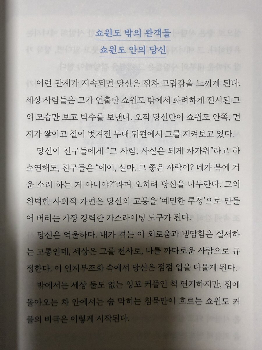 우리는 때때로 사랑 안에서 가장 깊은 외로움을 경험한다. 손을 맞잡고 있지만 마음은 닿지 않고, 함께 있지만 혼자인 것 같은 그 기묘한 감각. 단순한 권태나 일시적인 갈등이 아닐 것이다. 관계의 구조 자체가 비틀어져 있을 때, 우리는 사랑이라는 이름 아래 서서히 자신을 잃어간다. 나의 사랑에 대해 생각해 본다. 처음에 모든 것은 완벽한 설렘으로 시작되었다. 작은 기침 소리에도 약을 사 들고 달려왔고, 내가 좋아하는 것을 기억했으며, 나의 말에 귀 기울이는 듯했다. 주변 사람들 은 " 좋은 사람 만났다 " 며 축하했고, 나 역시 '이 사람이구나 ' 싶었다. 하지만 그 완벽함은 오래가지 않았다. 관계가 깊어질수록, 이상한 균열이 보이기 시작했다. 처음에는 미덕처럼 보였던 그의 효심과 착함이 어느새 당신을 질식시키는 벽이 되어 있었다. 점점 더 많이 노력했지만, 그와의 거리는 좁혀지지 않았다. 오히려 더 애쓸수록 더 외로워지는 역설 속에 갇혔다. 무엇이 문제이었을까? 내가 만난 것은 사랑이 아니라, 정교하게 위장된 지배의 관계였을 가능성이 크지 않을까...우리가 흔히 떠올리는 나르시시스트는 자신을 과시하고, 타인을 노골적으로 무시하며, 자기중심적인 사람이다. 그런 사람은 알아보기 쉽다. 문제는 '내현적 나르시시스트'다. 이들은 겉으로는 세상에서 가장 겸손하고 이타적으로 보인다. 누구에게나 친절하고, 부모님께 효도하며, 약자를 배려하는 것처럼 행동한다. 하지만 그 이면에는 채워지지 않는 공허함과 결핍이 있다. 그들은 타인의 고통을 머리로는 이해하지만, 가슴으로는 느끼지 못한다. 심리학에서는 이를 '차가운 공감'이라 부른다. 인지적으로는 상대의 감정을 파악하지만, 정서적으로는 전혀 공명하지 않는 상태. 그래서 내가 우는 모습을 보고도 불편함만 느낄 뿐, 함께 아파하지 않는다. "나는 지금 힘들다"고 말할 때, 돌아오는 말은 언제나 비슷했다. "네가 너무 예민한 거야." "다른 사람들은 다 괜찮다던데.""내가 뭘 잘못했는데?" 이런 반응 앞에서 나는 점점 자신을 의심하기 시작한다. ' 정말 내가 예민한 걸까? ' ' 내가 이해심이 부족한 걸까?' 하지만 감각은 틀리지 않았다. 그 불편함, 답답함, 설명 할 수 없는 서늘함. 그것들은 모두 진짜였다.내현적 나르시시스트와의 관계에서 가장 혼란스러운 지점은 '제3자의 존재'다. 나의 경우를 생각해 본다. 많은 경우 그것은 어머니, 혹은 가족이다. 사랑을 나누면서도, 정작 중요한 결정에서는 언제나 가족의 의견을 우선한다. 나의 생일보다 어머니의 전화가 먼저고, 나의 아픔보다 어머니의 기분이 더 중요하다. '정서적 근친'이라 불리는, 건강하지 못한 유착 관 계다. 어린 시절부터 어머니의 감정받이 역할을 해왔고, 그 과정에서 자기 자신의 감정과 욕망을 발달시킬 기회를 잃었다. 그는 착한 아들이 되기 위해 자기 자신을 지워왔고, 이제는 자아가 없는 빈 껍데기만 남았다. 그러니 진정으로 사랑하는 것은 불가능하다. 자기 자신조차 사랑할 줄 모르는 사람이 타인을 사랑할 수는 없으니까. 그의 삶에서 '연인'이 아니라 '부속품'에 가깝다. 그의 세상 속에서 당신은 언제나 참고인이고, 조연이며, 엑스트라일 뿐이다. 이런 관계에서 나는 점점 더 많은 것을 내어준다. 더 이해하려 하고, 더 참으려 하고, 더 사랑하려 한다. " 내가 조금만 더 잘하면 변할 거야 " 라는 희망을 품고. 하지만 밑 빠진 독에 아무리 물을 부어도 독은 차지 않는다. 그는 나의 에너지를 흡수하면서도 결코 채워지지 않 는다. 오히려 내가 행복해하면 그것을 시기하고, 내가 성장하면 불안해한다. 그에게 필요한 것은 동등한 파트너가 아니라, 자신을 떠받쳐 줄 지지대이기 때문이다. 나의 행복이 그의 불행이 되는 기묘한 역학이 작동한다. 경제적인 측면에서도 이 중성이 드러난다. 그는 "내 돈은 엄마 돈"이라고 하면서도, 나의 돈은 우리 생활비"가 되어야 한다고 생각한다. 나는 서서 히 경제적으로도, 정서적으로도 고갈되어 간다.가장 무서운 것은, 이런 관계 속에서 판단력 자체가 흐려진다는 점이다. 심리학에서는 이를 '브레인 포그(Brain Fog)'라고 한다. 지속적인 가스라이팅과 정서적 학대 속에서 당신의 뇌는 제대로 작동하지 못한다. 똑똑하고 주체적이었던 당신 이 어느새 자신의 감정조차 신뢰하지 못하는 사람이 되어 있다. 더 나아가 '트라우마 본딩', 즉 학대적 관계에 대한 중독이 발생한다. 그가 가끔씩 보여주는 친절과 애정이 마치 도박에서의 대박처럼 느껴진다. 뇌는 사랑이 아니라 불확실한 보상 체계에 중독된 것이다. 그래서 알면서도 떠나지 못한다. 이것이 사랑이라고 착각한다. 이런 관계에서 벗어나는 첫걸음은 인정하는 것이다. "나는 지금 아프다"라고 솔직하게 말할 용기를 내는 것. 당신의 고통은 예민함이 아니라 정당한 반응이 었다는 것을 받아들이는 것이다. 또한 구원자 환상을 버리는 것이다. 그를 고칠 수 없다. 아무리 사랑해도, 아무리 이해해도, 그는 변하지 않는다. 변화는 본인이 자신의 문제를 인식하고 진심으로 변하고자 할 때만 가능하다. 나의 희생이 그를 구원하지 않는다. 다만 나만 소진될 뿐이다. 단호한 경계선을 긋