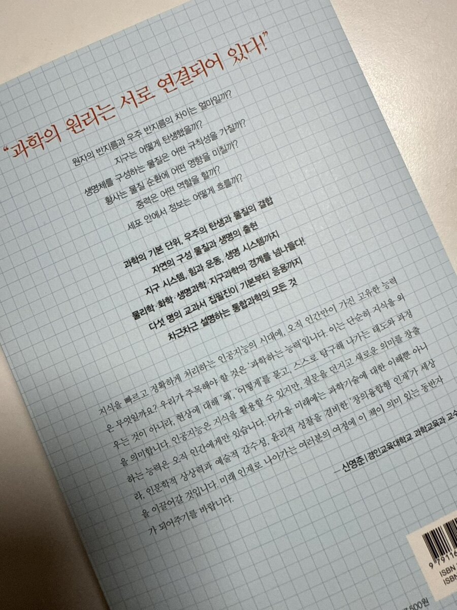 21세기 교육현장에서 가장 뜨거운 화두는 단연 인공지능과의 공존이다. ChatGPT를 비롯한 생성형 AI가 등장하면서 정보 습득과 암기 위주의 학습은 더 이상 의미가 없어졌다. 이제 우리에게 필요한 것은 기계가 할 수 없는 인간 고유의 능력, 즉 창의적 사고와 통합적 관점, 그리고 끊임없는 탐구정신이다. 통합과학 교육은 바로 이러한 시대적 요구에 부응하는 핵심 교과로 자리매김하고 있다. 기존의 물리, 화학, 생물, 지구과학으로 분절되어 있던 과학 지식을 하나의 큰 틀에서 바라보게 함으로써, 학생들은 복잡한 현실 문제를 다각도로 분석하고 해결할 수 있는 역량을 기를 수 있다. 이는 정보를 처리하는 AI와 차별화되는 인간만의 통찰력과 직결된다. 이번에 이러한 통합적 창의력을 향상시키기 위한 교육 과정을 잘 분석 설명해 주는 신간을 읽을 기회가 있었다. <통합과학 교과서 한 번에 통과하기1> 이었다.
