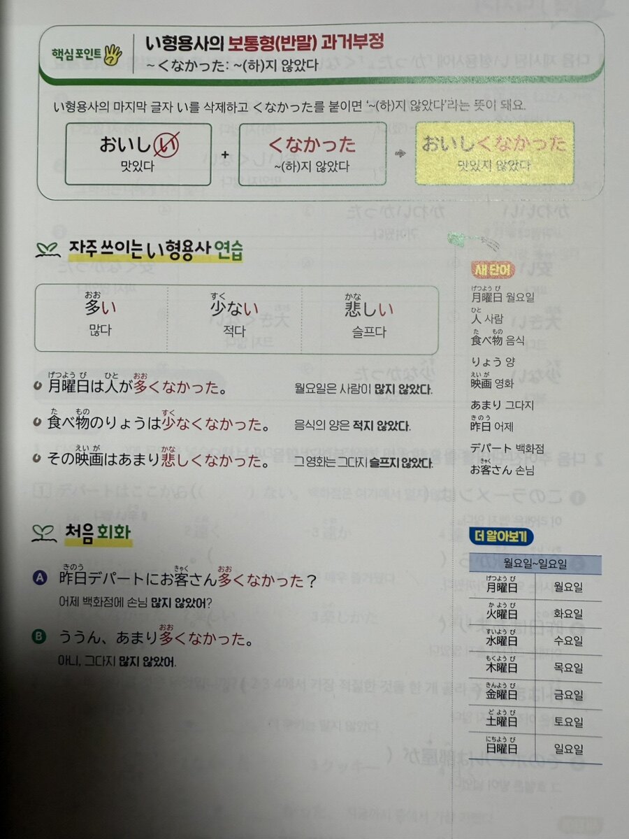 총 30개의 챕터로 나누어진 내용은 일본어 문법의 핵심을 체계적으로 다룬다. 기초 다지기 단계 (Chapter 1-10)에서는 명사의 정중형부터 시작한다. 일본어 학습에서 가장 중요한 존댓말 개념을 두 개 챕터에 걸쳐 상세히 다루는 것은 현명한 선택이다. 이어서 지시대명사 'こ・そ・あ・ど' 체계를 학습하고, 존재동사의 개념을 익힌다. 숫자와 날짜 표현은 실생활에서 즉시 활용 가능한 실용적인 내용이다. 특히 시간, 개수, 인원수 등을 구체적으로 다루어 학습자가 실제 상황에서 바로 사용할 수 있도록 구성했다. い형용사의 활용을 세 개 챕터에 걸쳐 다루는 것도 인상적이다. 형용사의 기본형부터 과거형, 부정형까지 단계적으로 학습할 수 있어 자연스러운 습득이 가능하다.