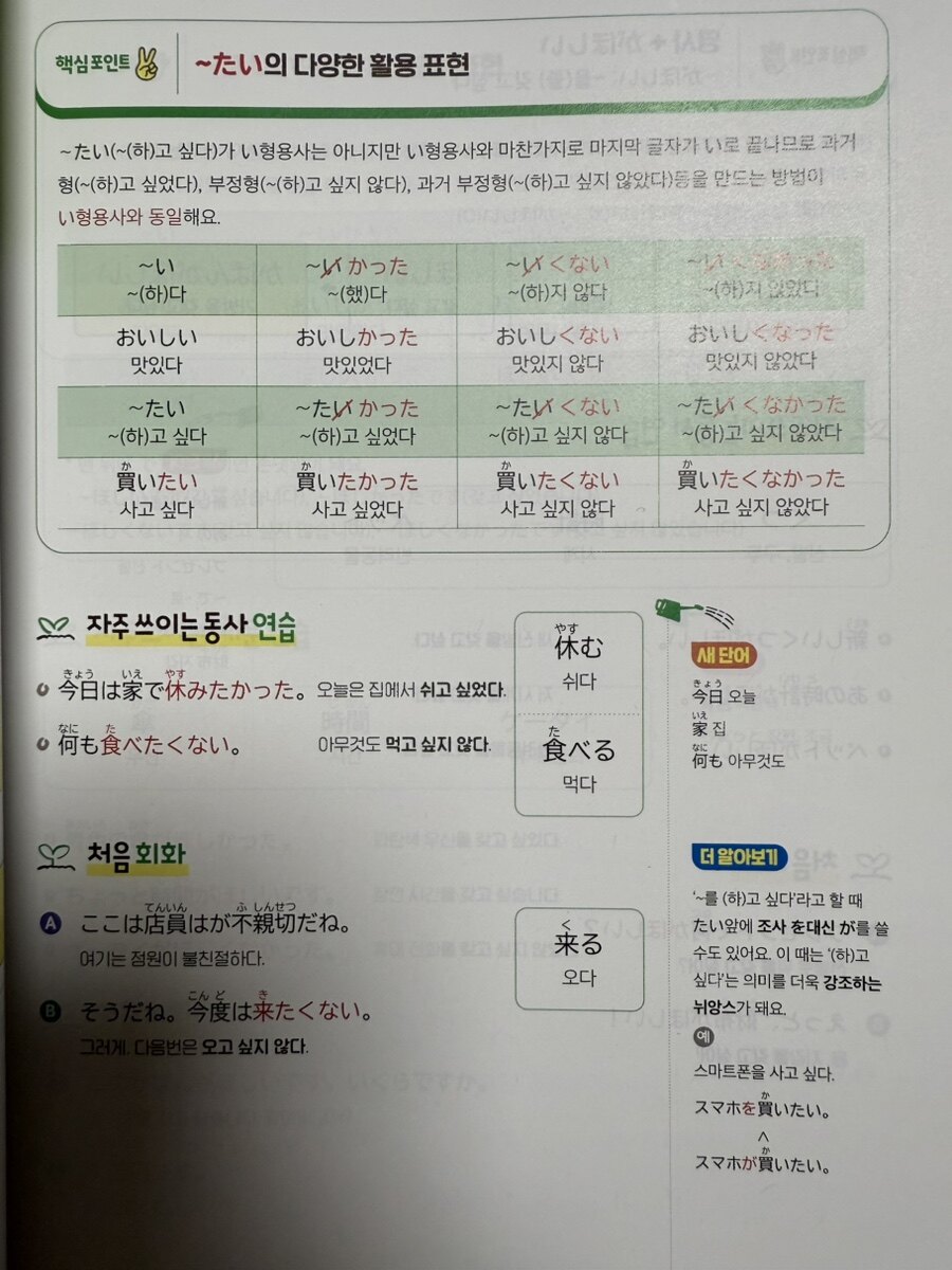심화 학습 단계 (Chapter 11-20)에서는 な형용사와 조사의 활용을 집중적으로 다룬다. 특히 'を' 대신 'が'를 사용해야 하는 な형용사들을 별도 챕터로 구성한 것은 학습자들이 자주 실수하는 부분을 정확히 짚어낸 것이다. 동사의 ます형 학습은 일본어 회화의 기초가 되는 중요한 부분이다. 두 개 챕터에 걸쳐 충분히 다루고, 이와 함께 사용할 수 있는 다양한 표현들을 추가로 학습하여 실용성을 높였다. 실전 활용 단계 (Chapter 21-30)는 가장 흥미로운 부분이다. 동사의 て형, た형, ない형 등 실제 회화에서 빈번히 사용되는 활용형들을 체계적으로 학습한다. 특히 명령형과 금지형, 의지형 등은 감정 표현과 직결되는 부분이라 학습 과정에서 일본어의 뉘앙스를 깊이 이해할 수 있다. 가능형으로 마무리하는 구성도 절묘하다. '할 수 있다'는 표현은 학습자가 자신감을 가지고 일본어를 사용할 수 있게 하는 상징적 의미가 있다.