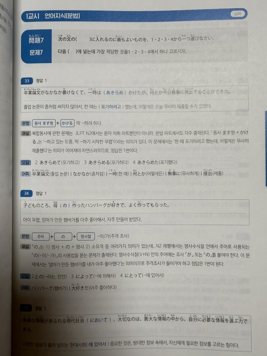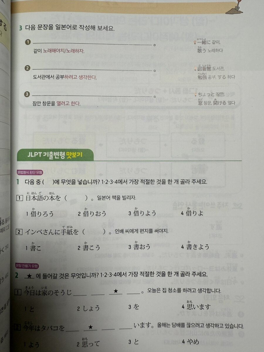 이론만으로는 언어를 습득할 수 없다. 이 책의 또 다른 강점은 실제 회화에서 자주 사용되는 예문들을 풍부하게 제공한다는 점이다. 각 챕터의 예문들은 일본인들이 일상에서 실제로 사용하는 자연스러운 표현들로 구성되어 있다. 특히 '처음 회화' 코너는 혁신적이다. 학습한 문법을 즉시 대화 상황에 적용해볼 수 있어, 이론과 실습의 완벽한 조화를 이룬다. A와 B의 대화문을 통해 문법이 실제 어떻게 사용되는지 체험할 수 있고, 이는 기계적인 암기를 넘어선 진정한 언어 습득으로 이어진다. 학습의 효과를 극대화하려면 적절한 피드백 시스템이 필요하다. 이 책은 이 부분에서도 탁월한 구성을 보여준다. 각 챕터의 '실력 다지기' 코너는 다양한 유형의 문제로 구성되어 있다. 표 채우기부터 시작해서 짧은 문장 완성, 작문, 그리고 JLPT 기출 변형 문제까지 단계적으로 난이도가 상승한다. 이러한 구성은 학습자가 부담 없이 시작해서 점진적으로 실력을 향상시킬 수 있도록 돕는다. 10개 챕터마다 등장하는 중간 평가는 장기 기억으로의 전환을 돕는 중요한 장치다. 학습 직후가 아닌 시간이 조금 지난 후에 다시 점검함으로써, 진정으로 내 것이 된 지식과 아직 부족한 부분을 명확히 구분할 수 있다.